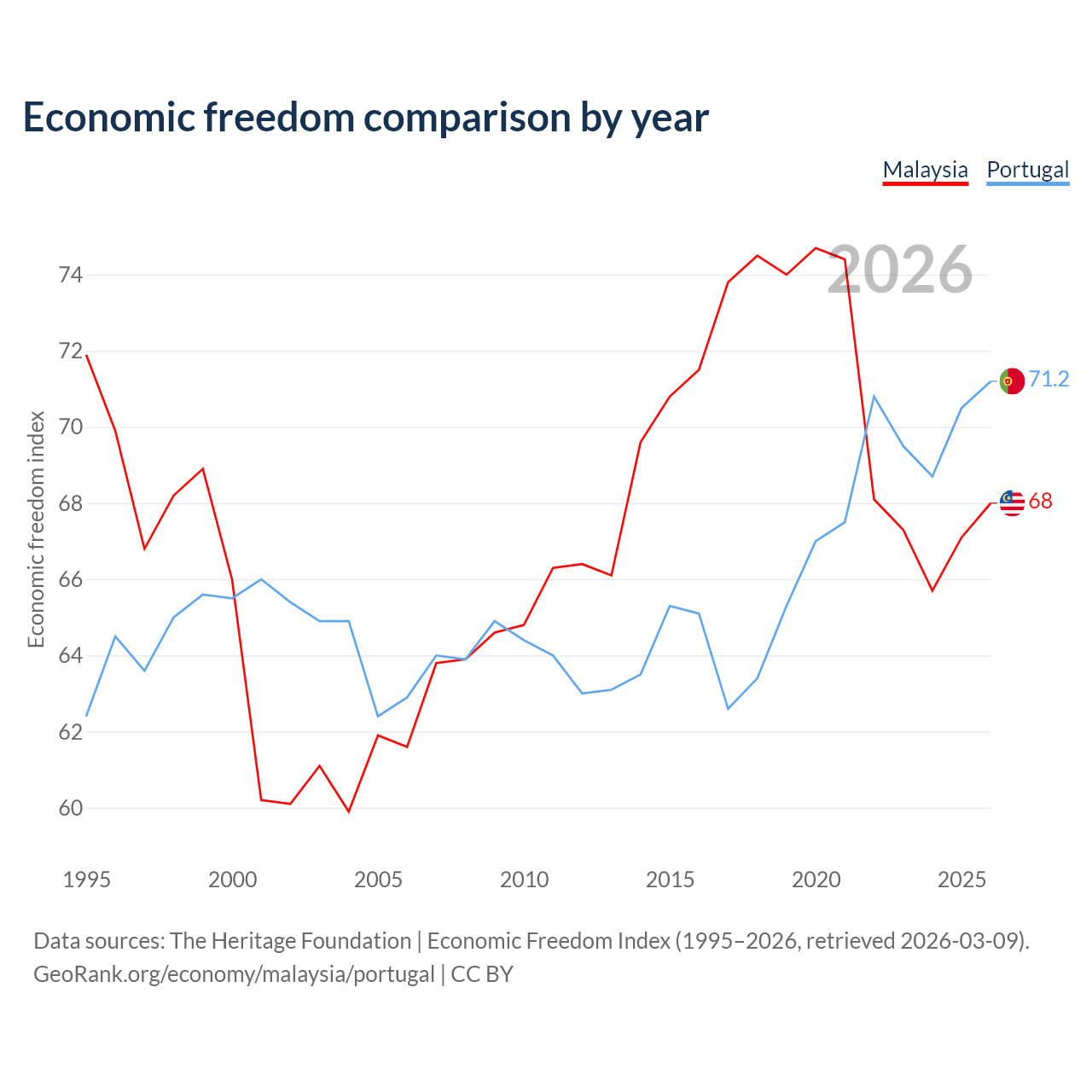 Data sources: The Heritage Foundation | Economic Freedom Index (1995–2026, retrieved 2026-03-09).
