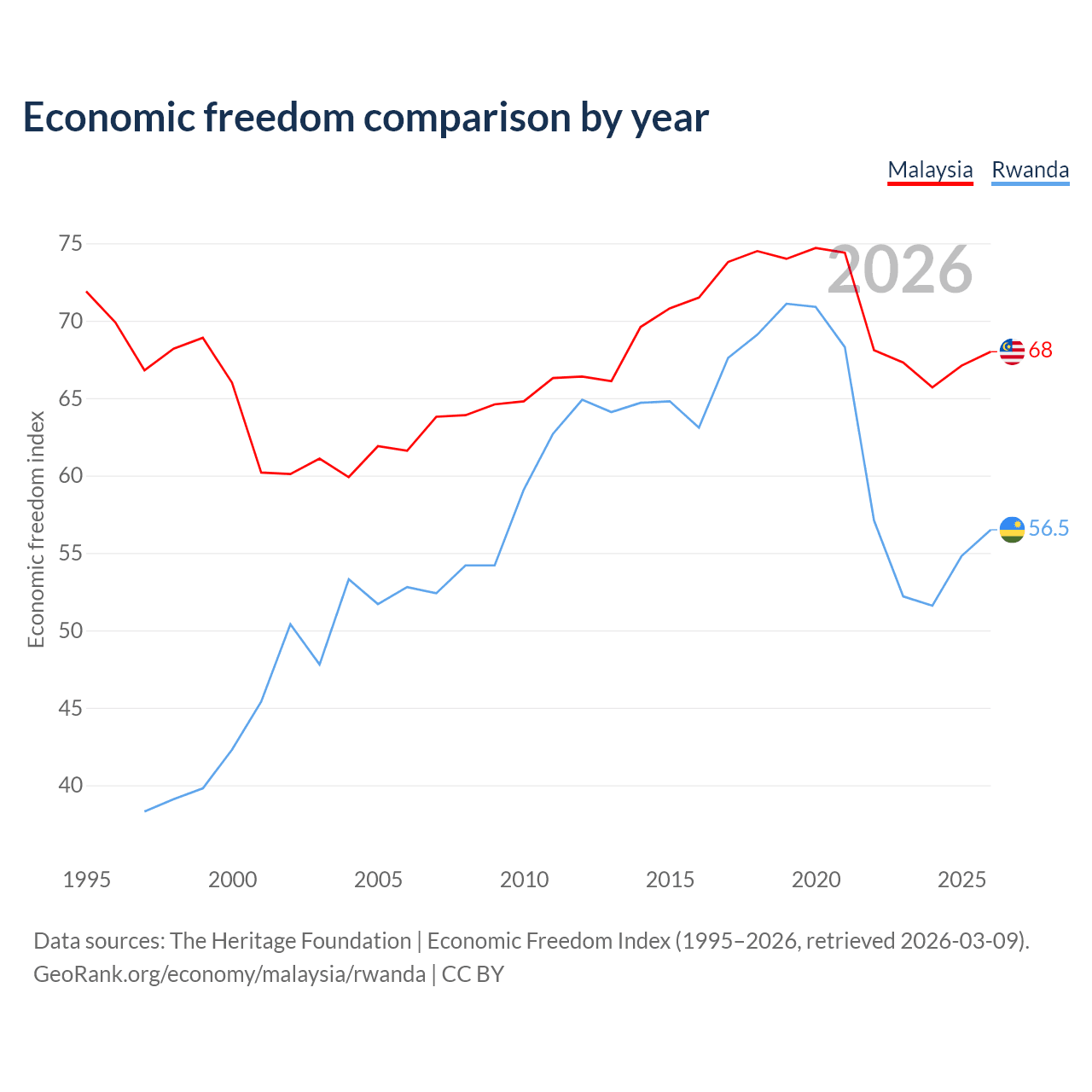 The Economic Freedom Index for Malaysia is 68, ranking 51/197, compared to 56.5 for Rwanda, ranking 121/197. The chart above displays a comparison of annual changes in economic freedom indexes.