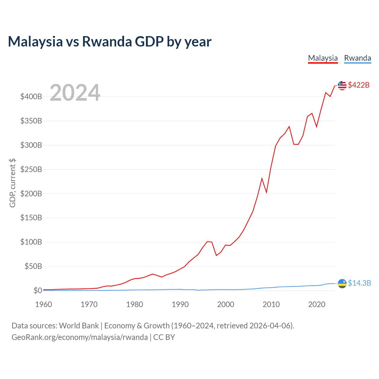 Malaysia has a GDP of $422B compared to $14.3B for Rwanda, ranking 38/197 and 144/197 by economy size, respectively.