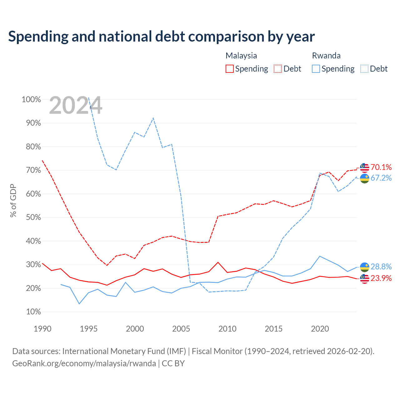 Malaysia has $296B in government debt (70.1% of GDP), compared to $9.58B (67.2% of GDP) in Rwanda.