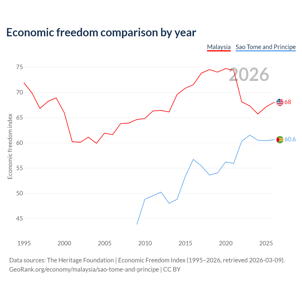 The Economic Freedom Index for Malaysia is 68, ranking 51/197, compared to 60.6 for Sao Tome and Principe, ranking 93/197. The chart above displays a comparison of annual changes in economic freedom indexes.