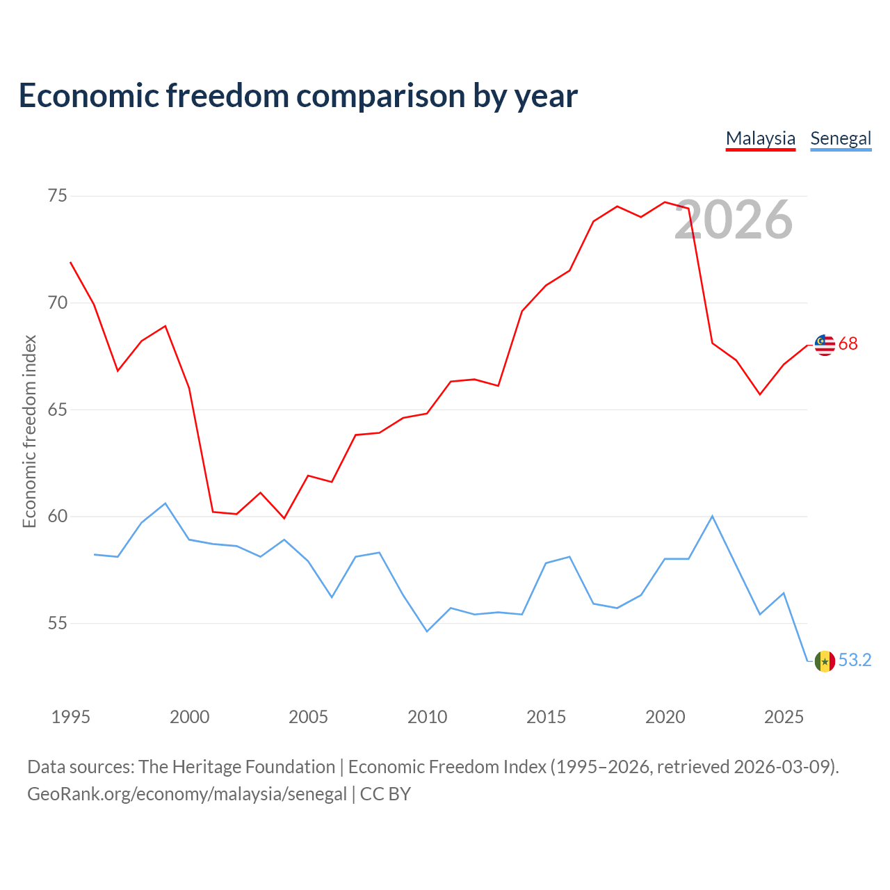The Economic Freedom Index for Malaysia is 68, ranking 51/197, compared to 53.2 for Senegal, ranking 140/197. The chart above displays a comparison of annual changes in economic freedom indexes.