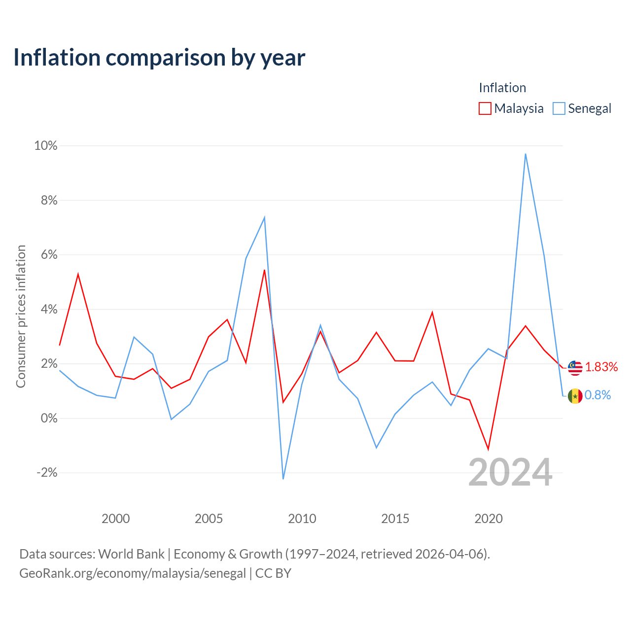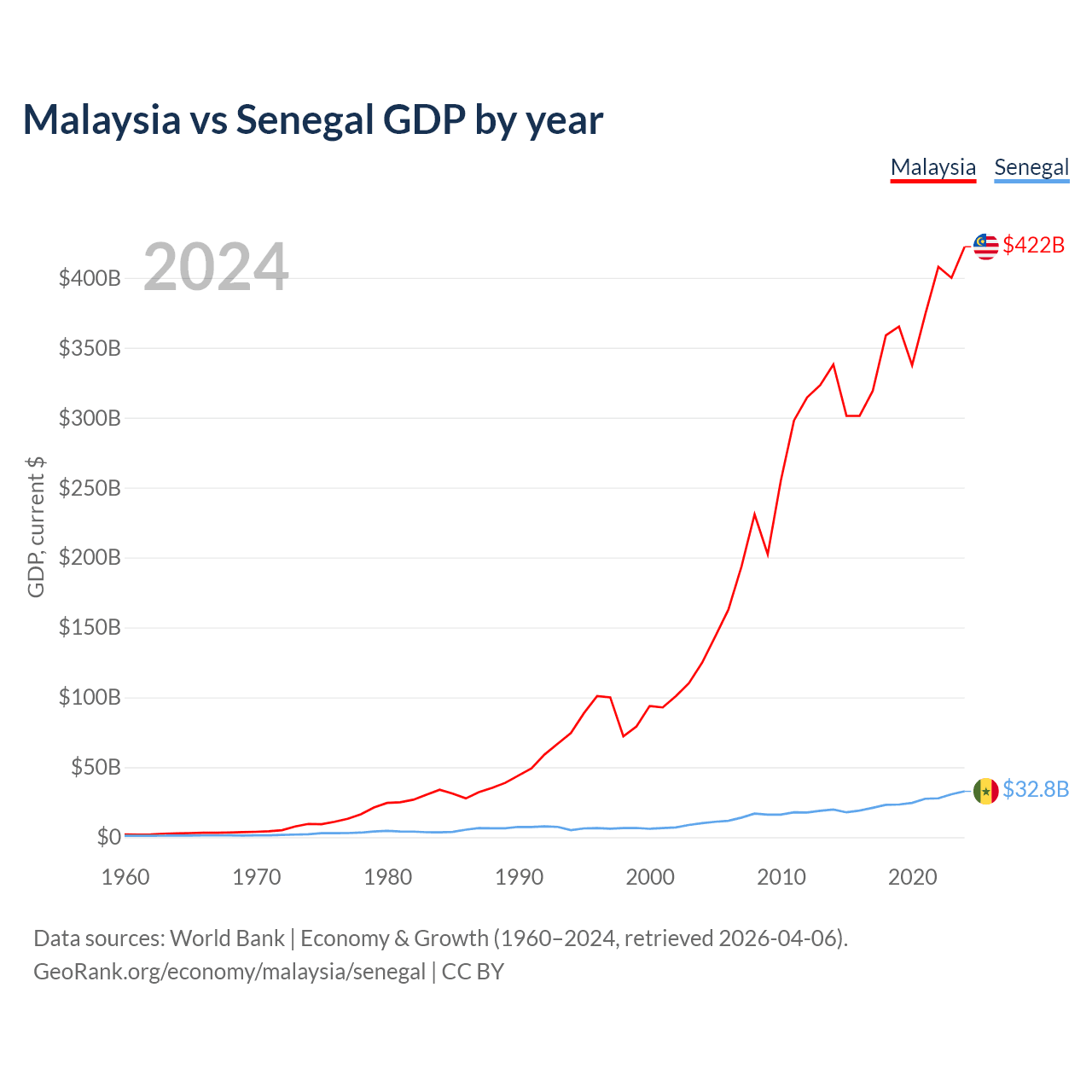 Malaysia has a GDP of $422B compared to $32.8B for Senegal, ranking 38/197 and 109/197 by economy size, respectively.