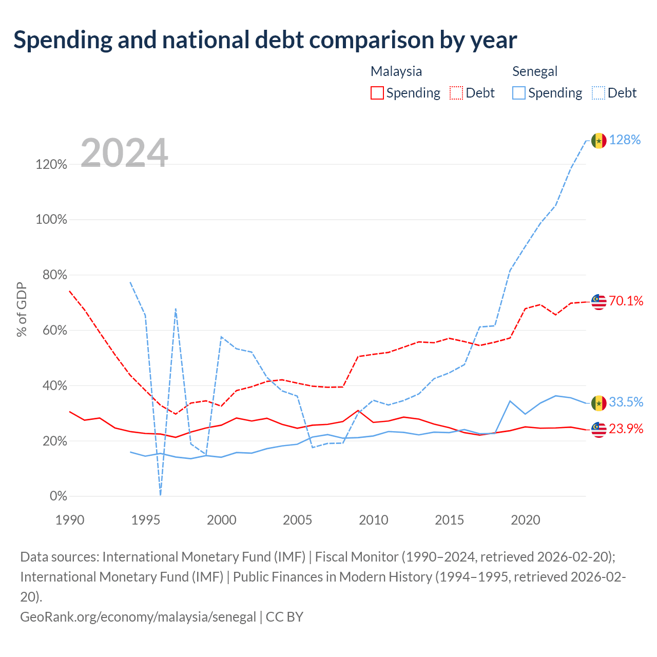 Malaysia has $296B in government debt (70.1% of GDP), compared to $42.1B (128.4% of GDP) in Senegal.