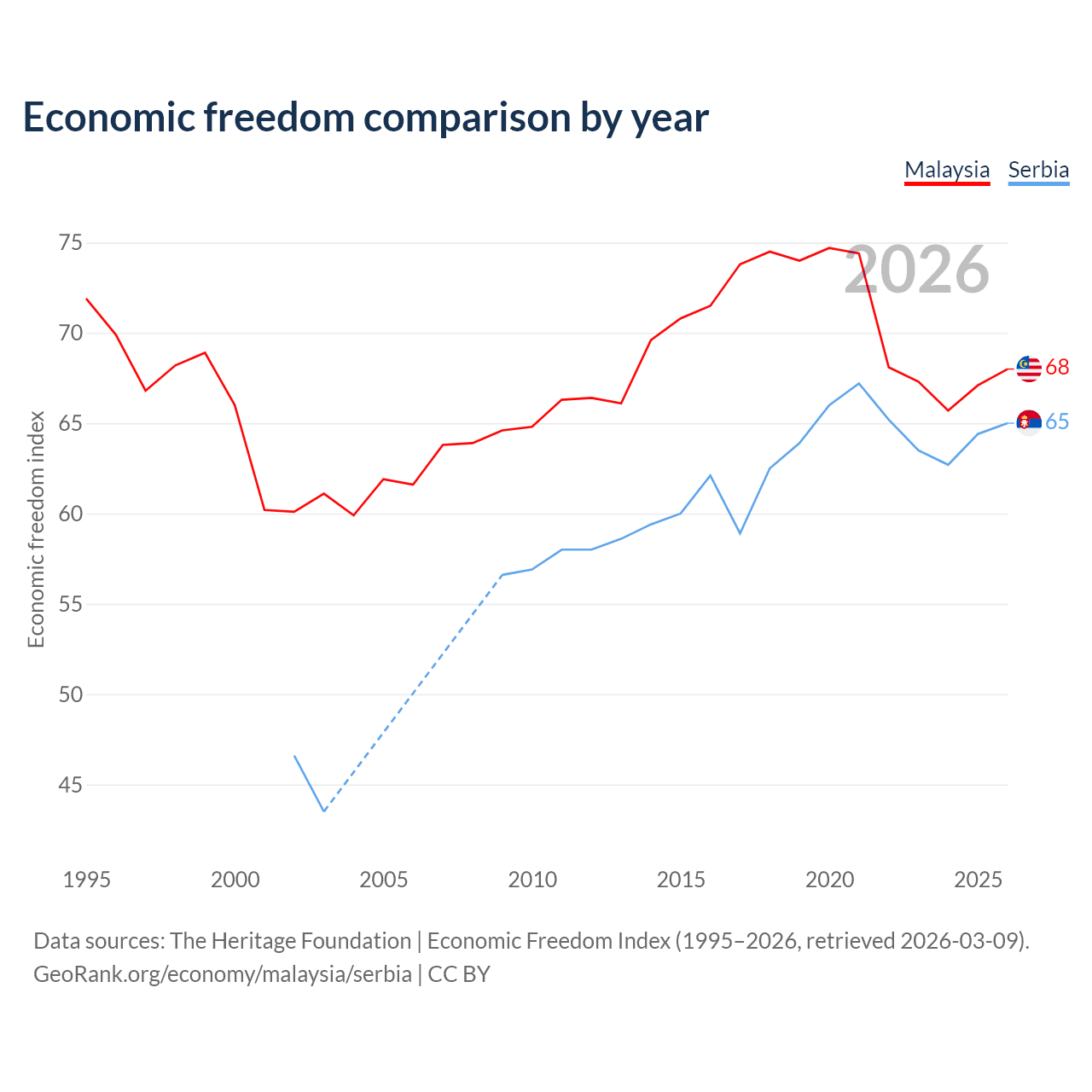 The Economic Freedom Index for Malaysia is 68, ranking 51/197, compared to 65 for Serbia, ranking 68/197. The chart above displays a comparison of annual changes in economic freedom indexes.