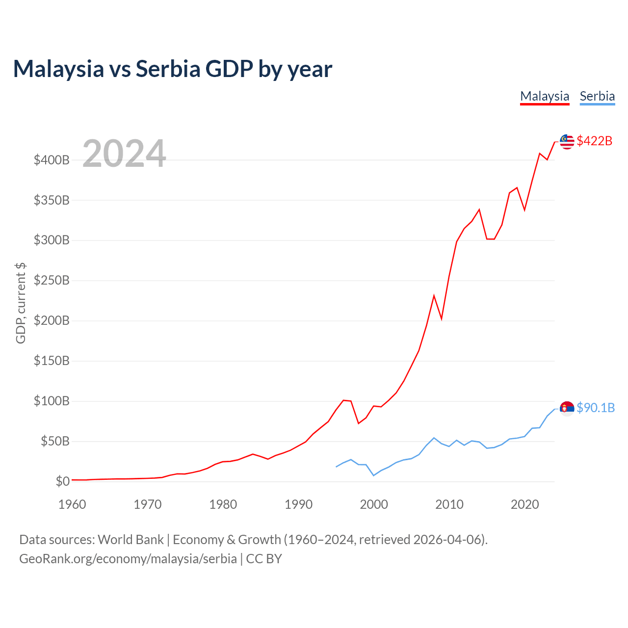 Malaysia has a GDP of $422B compared to $90.1B for Serbia, ranking 38/197 and 76/197 by economy size, respectively.