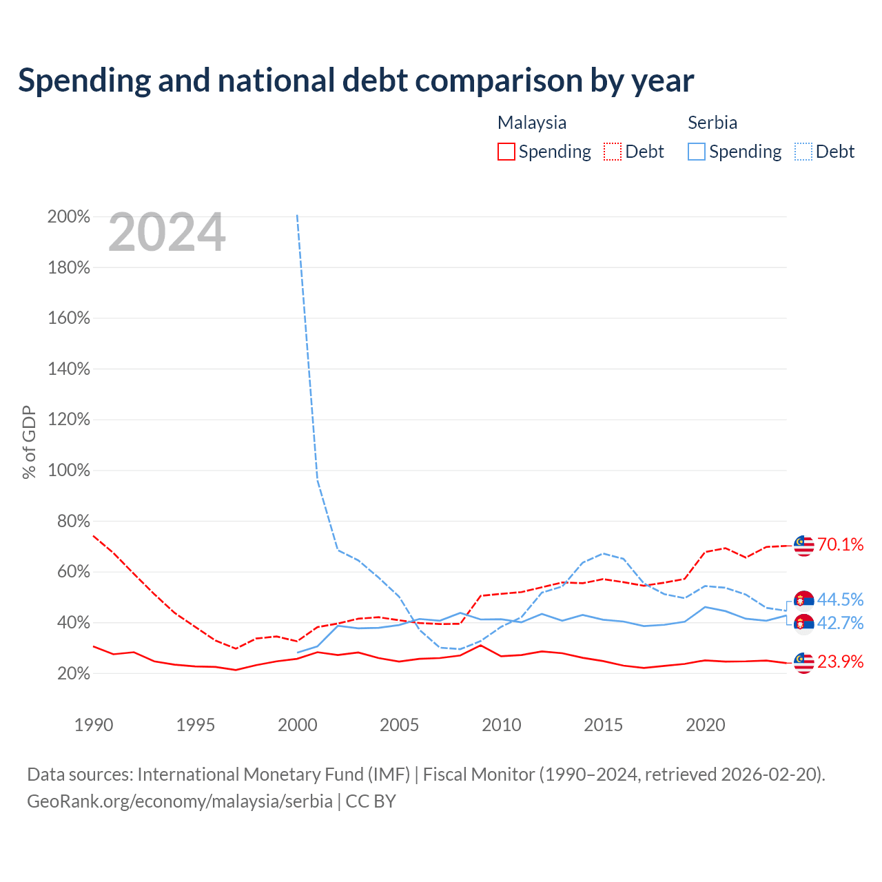 Malaysia has $296B in government debt (70.1% of GDP), compared to $40.1B (44.5% of GDP) in Serbia.