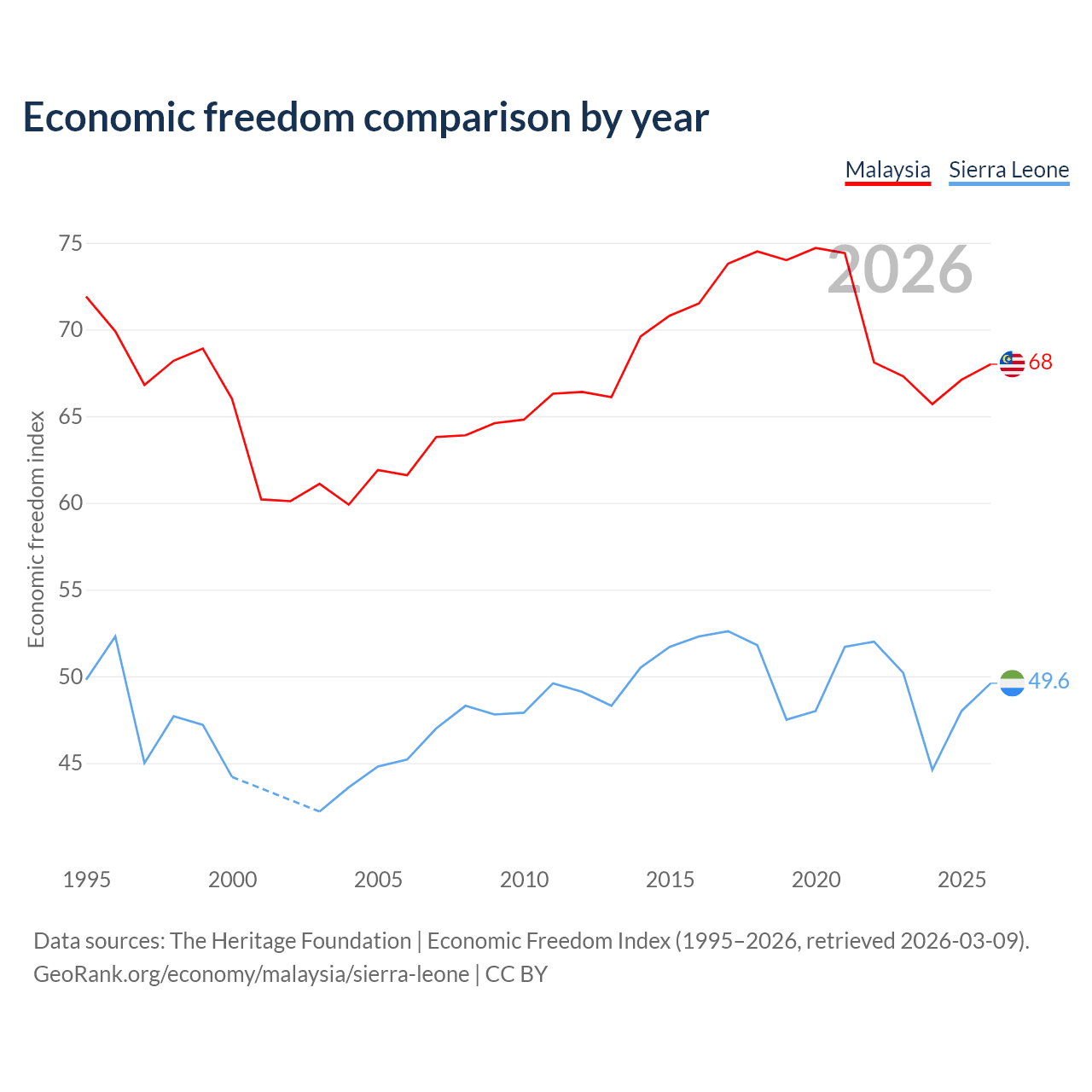 The Economic Freedom Index for Malaysia is 68, ranking 51/197, compared to 49.6 for Sierra Leone, ranking 165/197. The chart above displays a comparison of annual changes in economic freedom indexes.