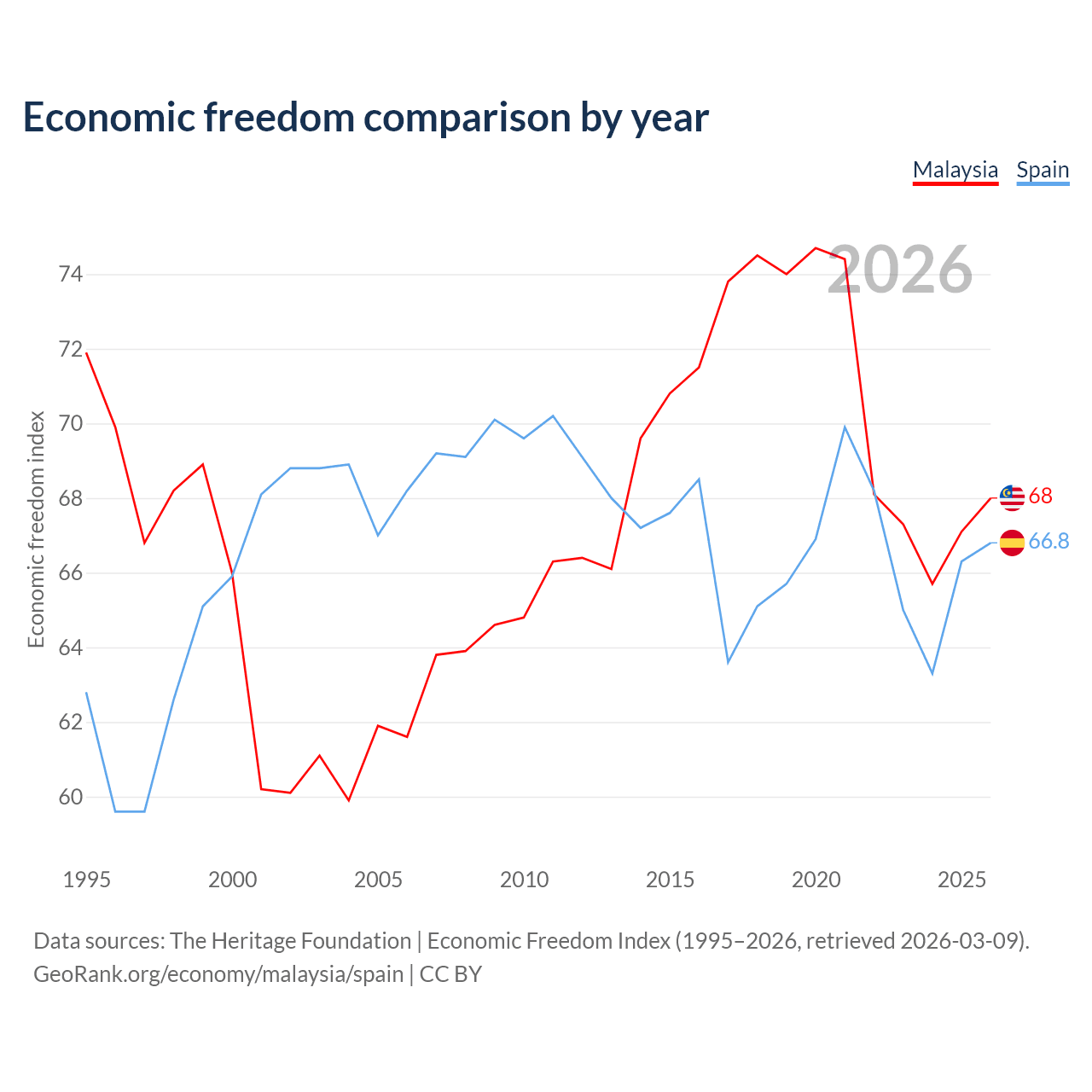 The Economic Freedom Index for Malaysia is 68, ranking 51/197, compared to 66.8 for Spain, ranking 59/197. The chart above displays a comparison of annual changes in economic freedom indexes.