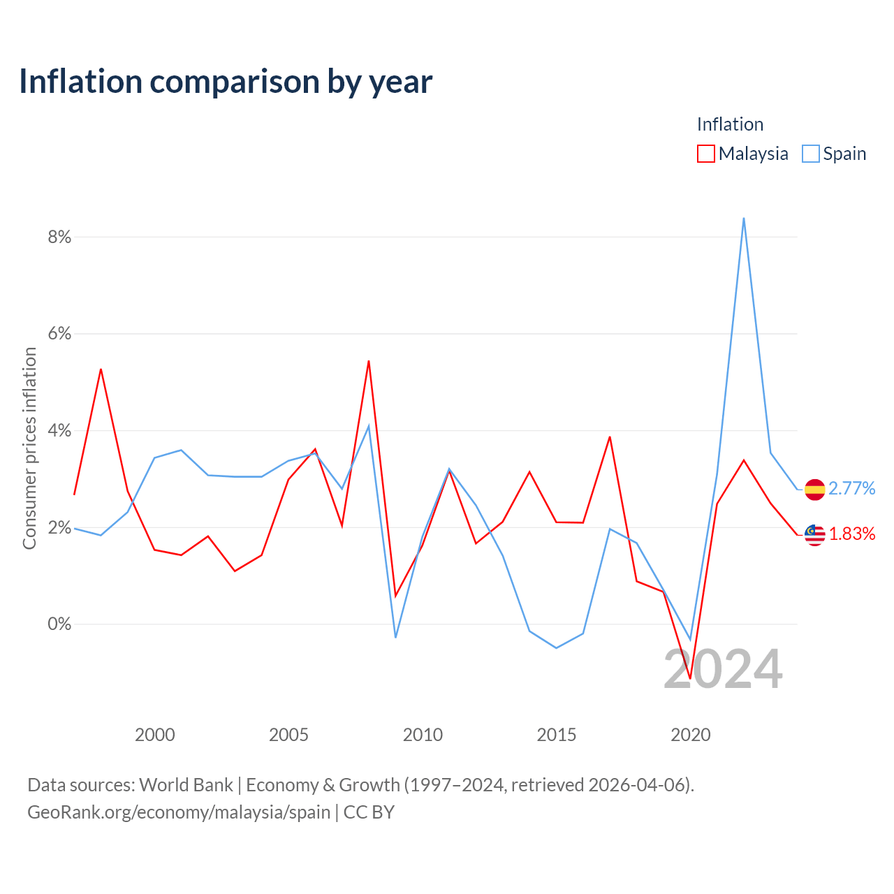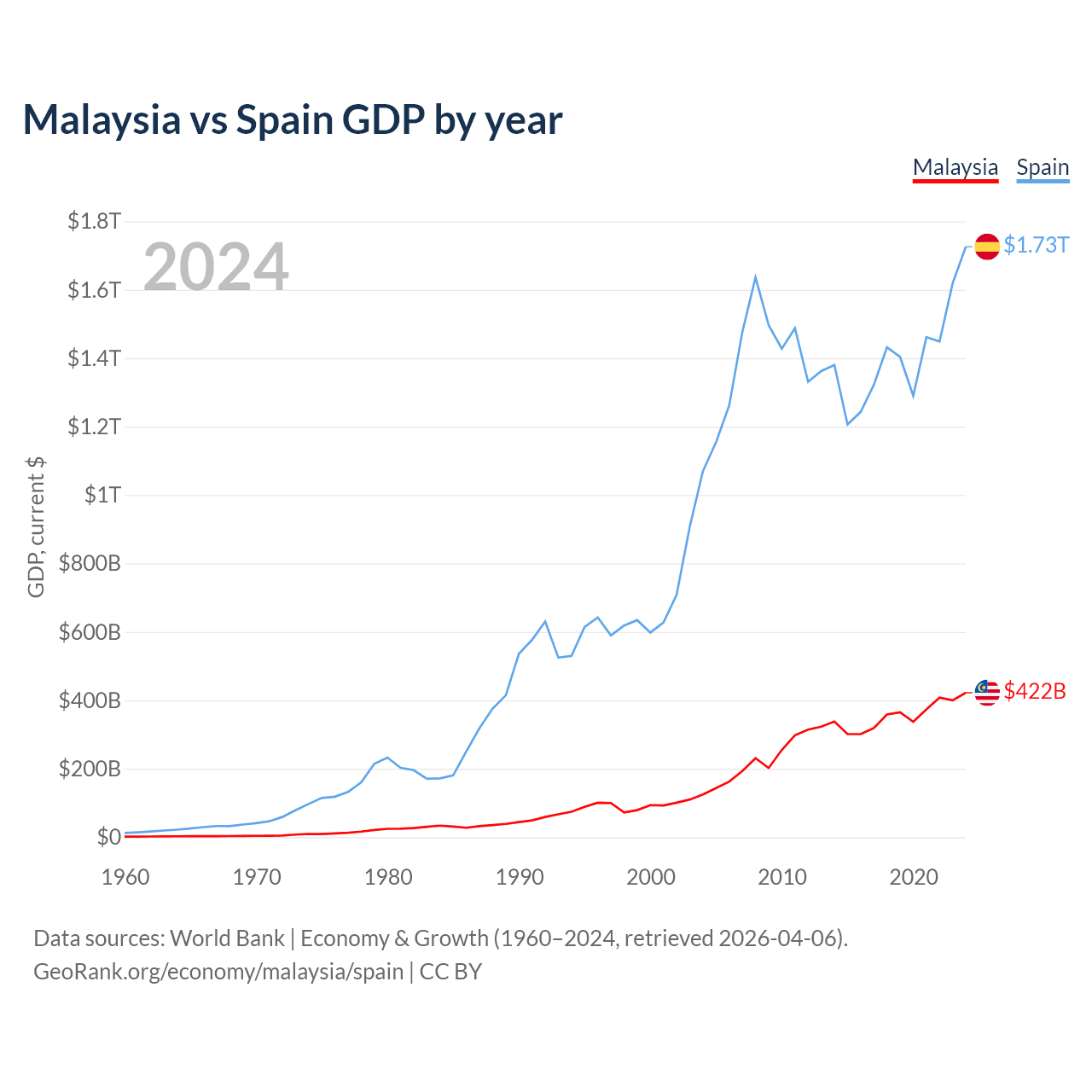 Malaysia has a GDP of $422B compared to $1.73T for Spain, ranking 38/197 and 15/197 by economy size, respectively.