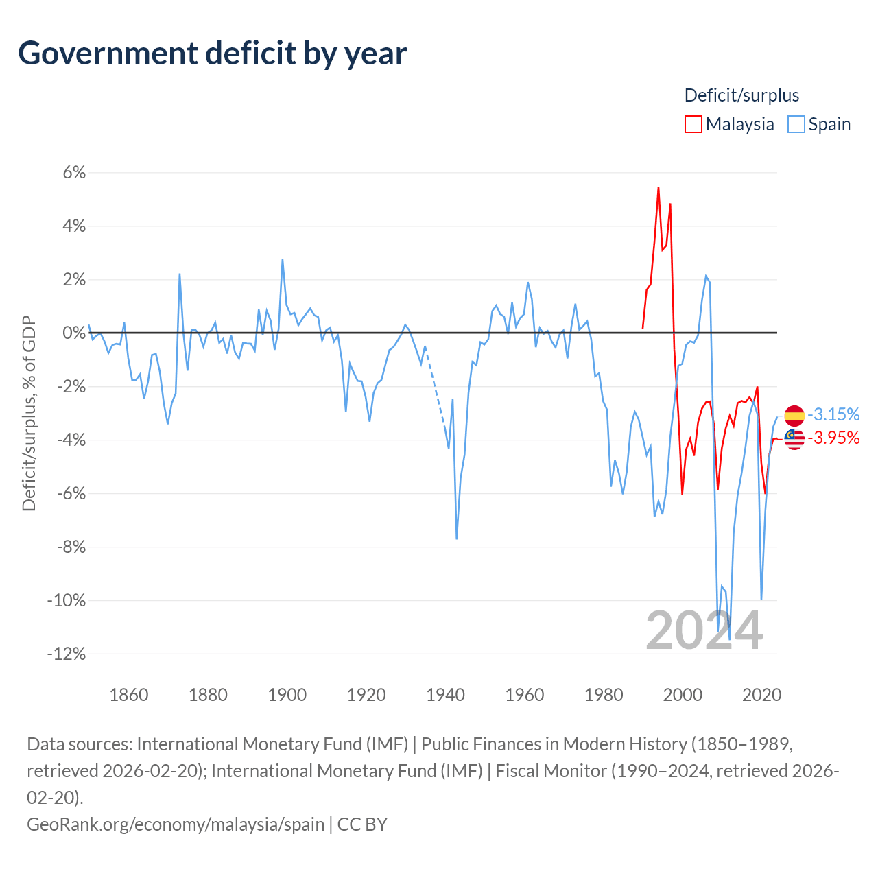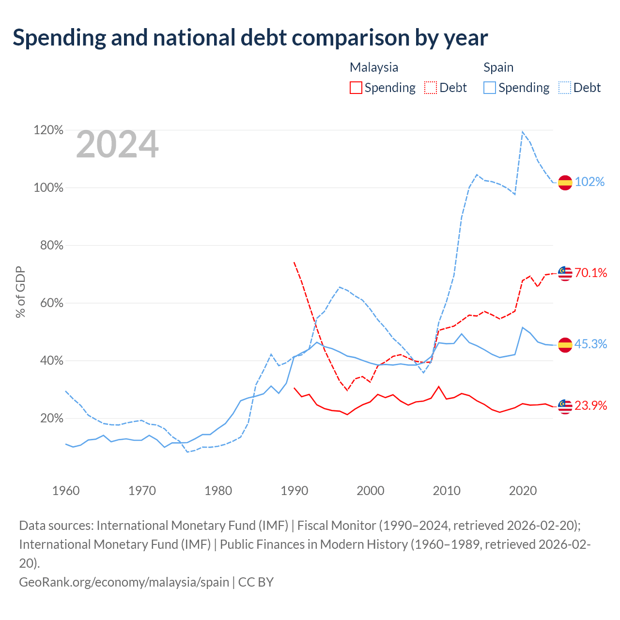 Malaysia has $296B in government debt (70.1% of GDP), compared to $1.75T (101.6% of GDP) in Spain.