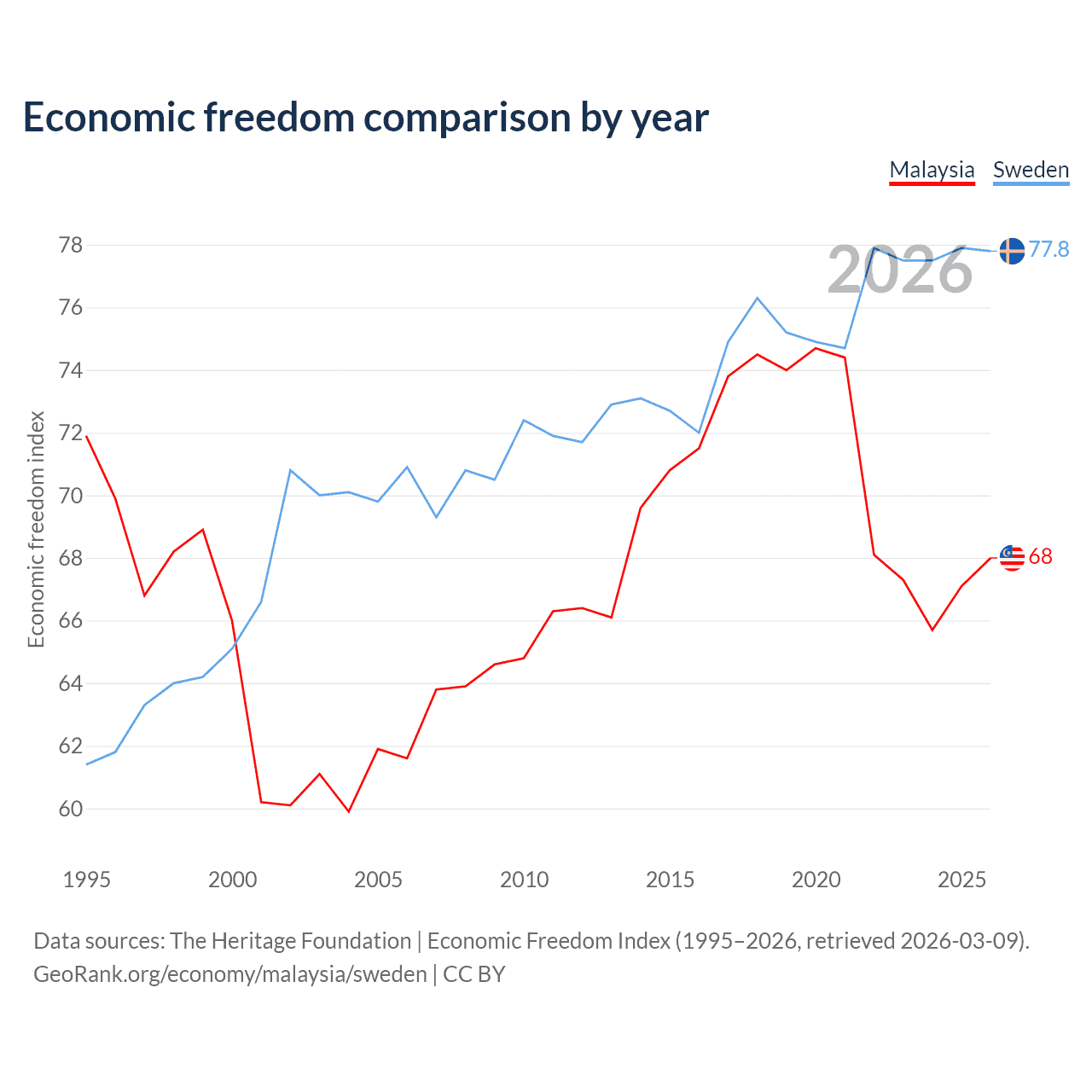 The Economic Freedom Index for Malaysia is 68, ranking 51/197, compared to 77.8 for Sweden, ranking 14/197. The chart above displays a comparison of annual changes in economic freedom indexes.