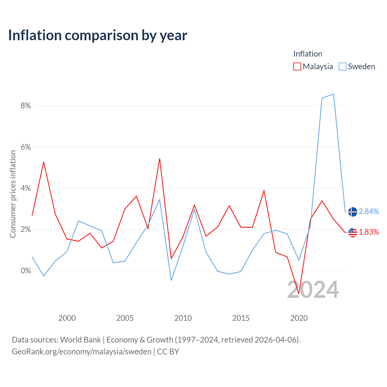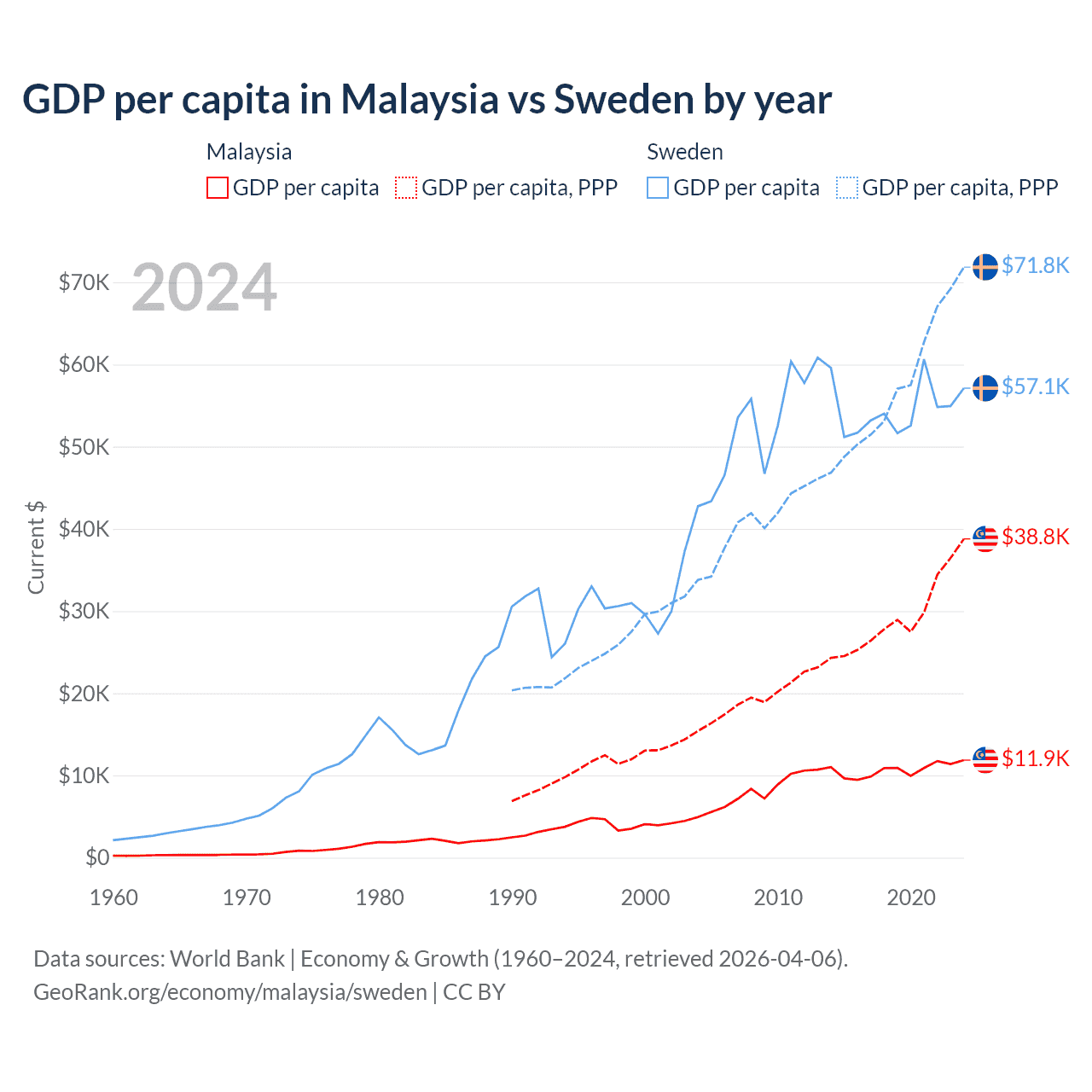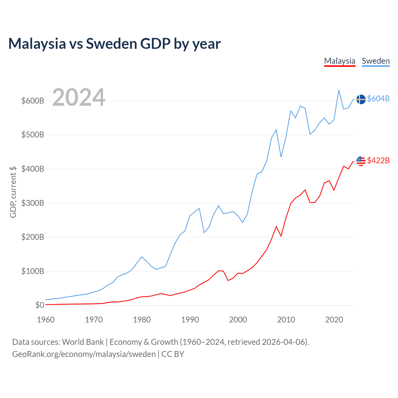 Malaysia has a GDP of $422B compared to $604B for Sweden, ranking 38/197 and 26/197 by economy size, respectively.