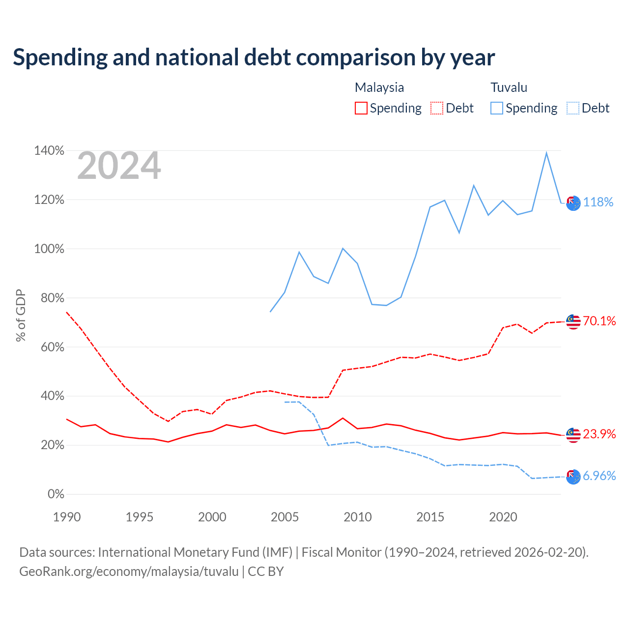 Malaysia has $296B in government debt (70.1% of GDP), compared to $4.15M (6.96% of GDP) in Tuvalu.