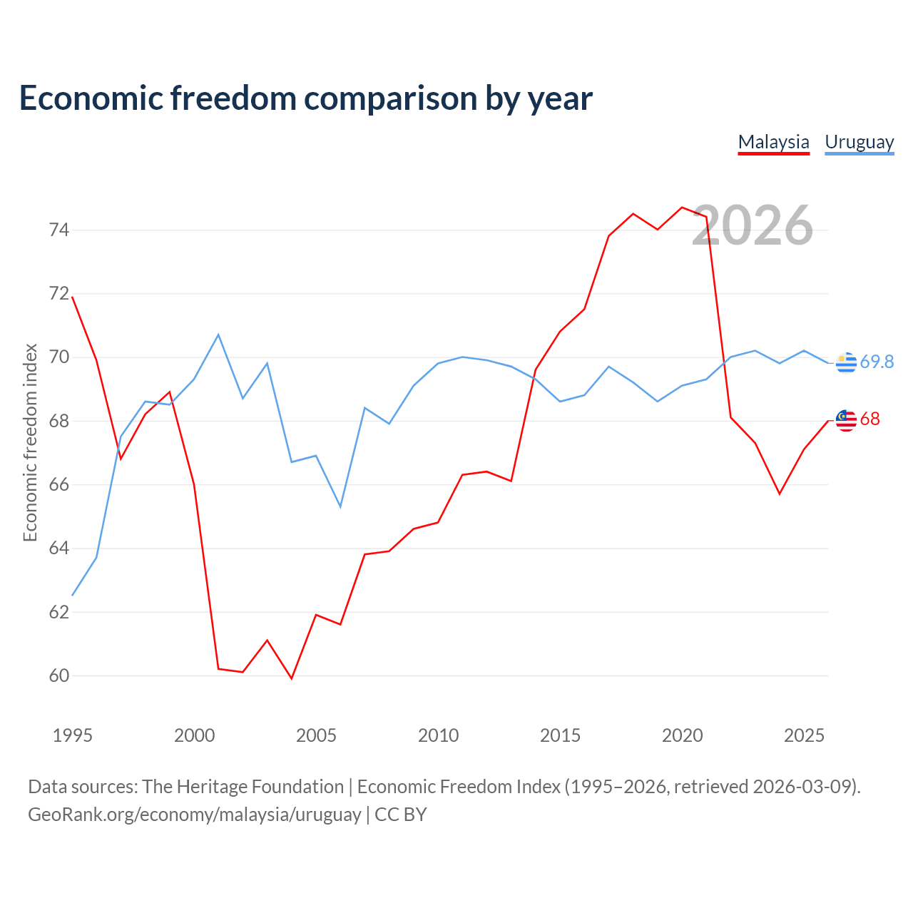 The Economic Freedom Index for Malaysia is 68, ranking 51/197, compared to 69.8 for Uruguay, ranking 39/197. The chart above displays a comparison of annual changes in economic freedom indexes.