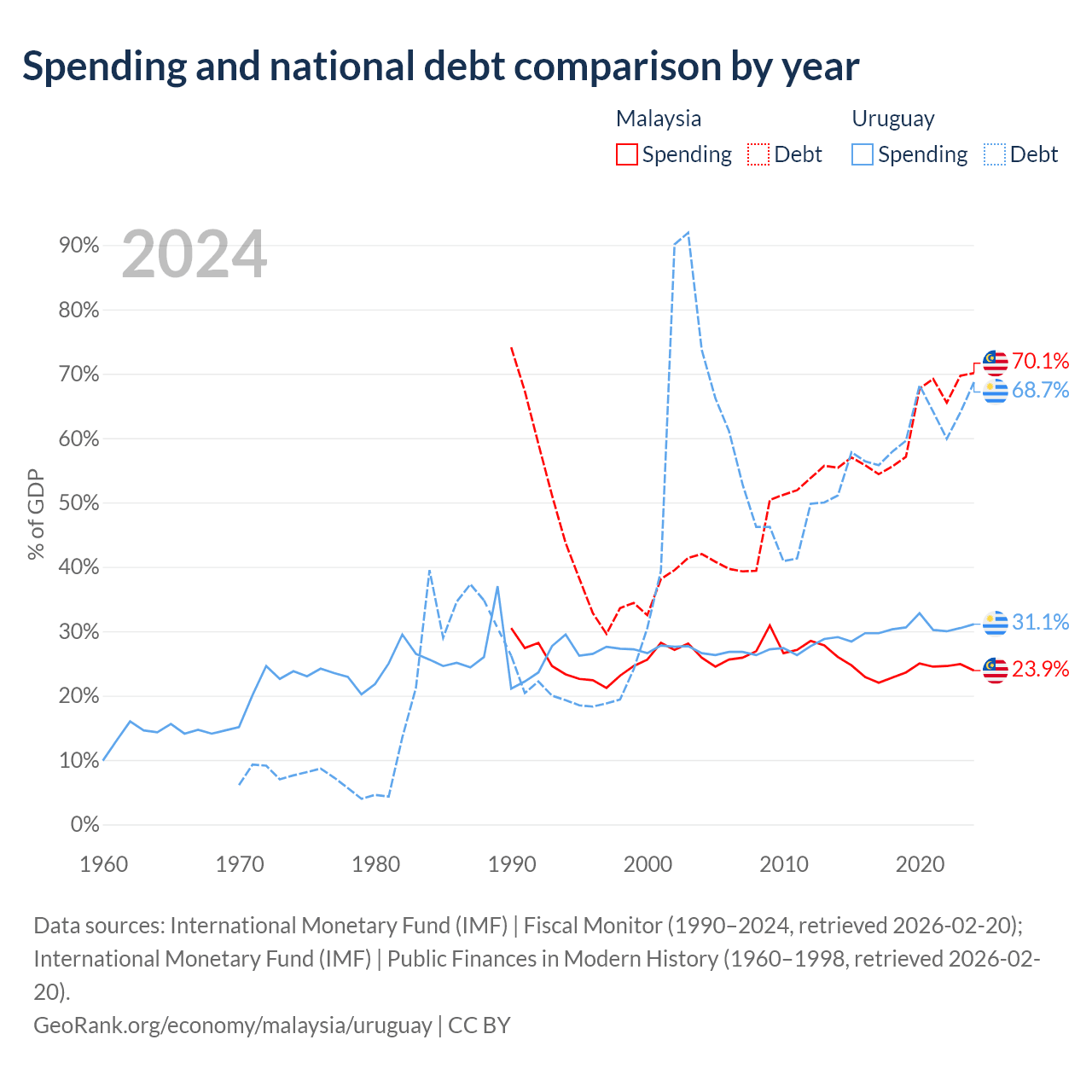 Malaysia has $296B in government debt (70.1% of GDP), compared to $55.6B (68.7% of GDP) in Uruguay.