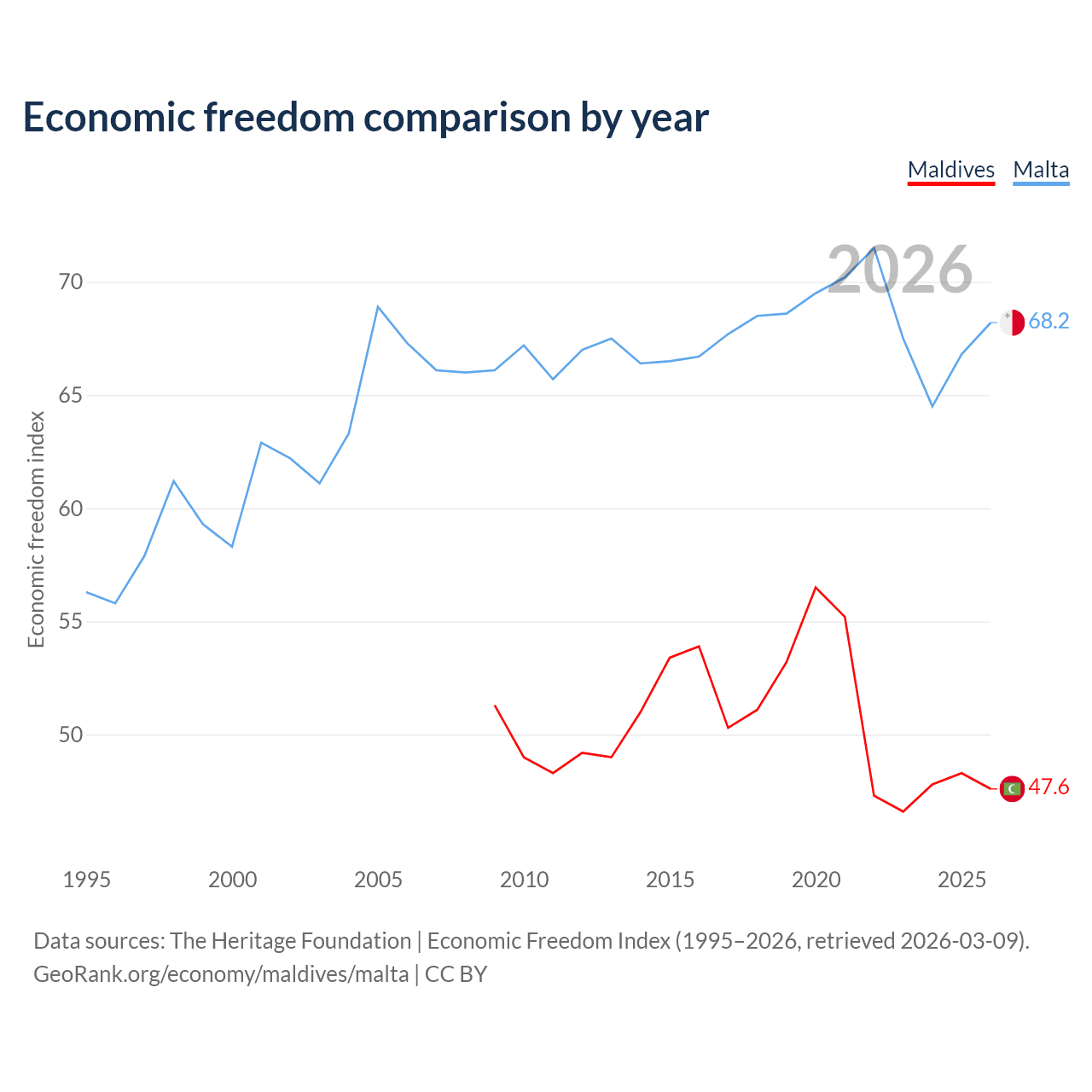 The Economic Freedom Index for Maldives is 47.6, ranking 174/197, compared to 68.2 for Malta, ranking 49/197. The chart above displays a comparison of annual changes in economic freedom indexes.