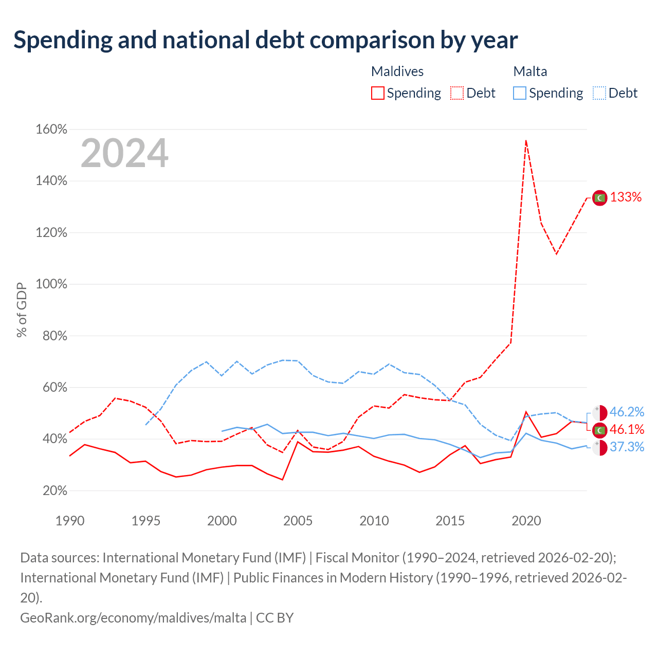 Maldives has $9.41B in government debt (133.3% of GDP), compared to $11.5B (46.2% of GDP) in Malta.