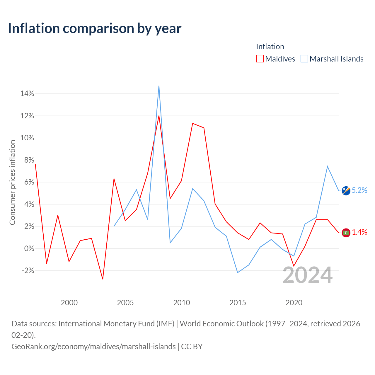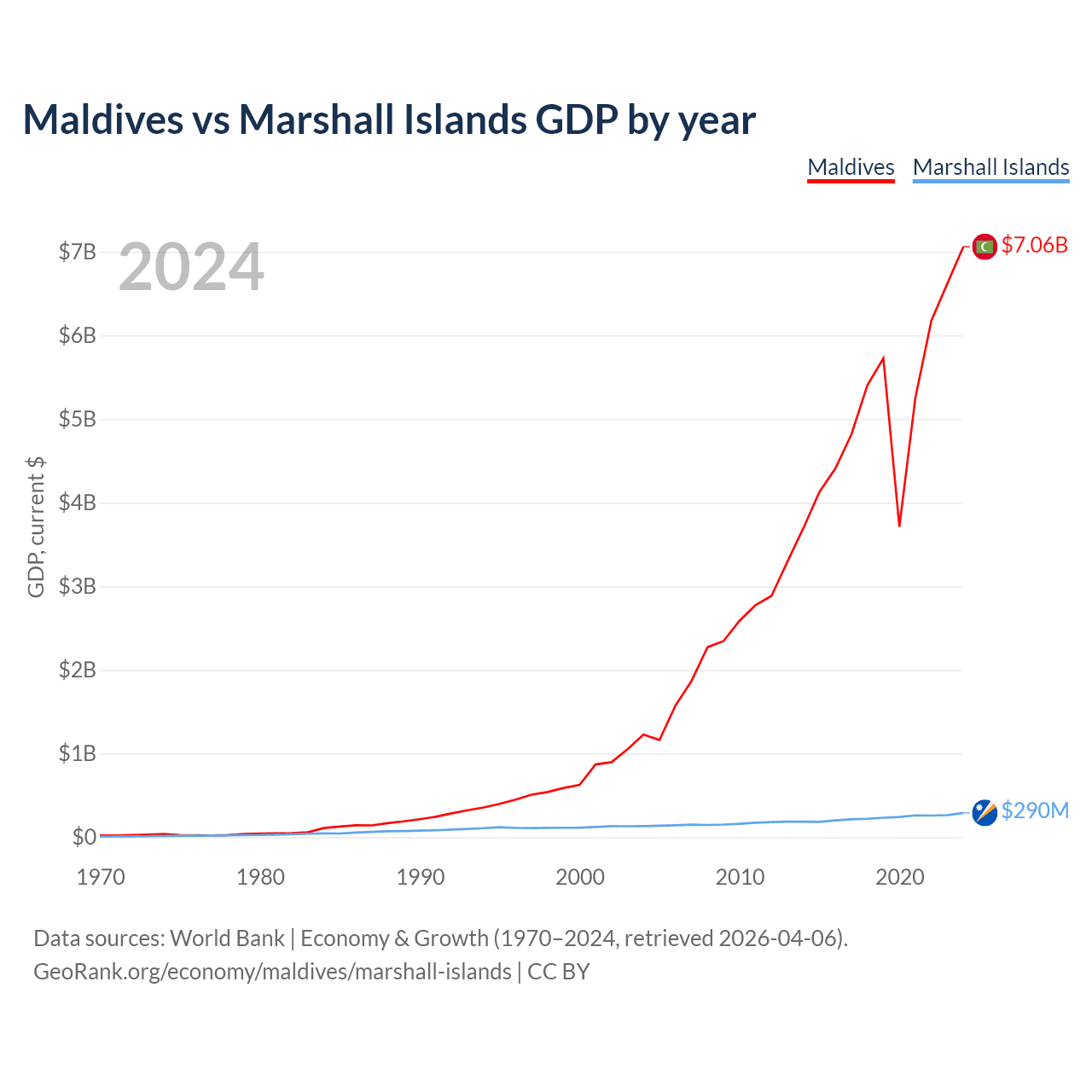 Maldives has a GDP of $7.06B compared to $290M for the Marshall Islands, ranking 159/197 and 193/197 by economy size, respectively.