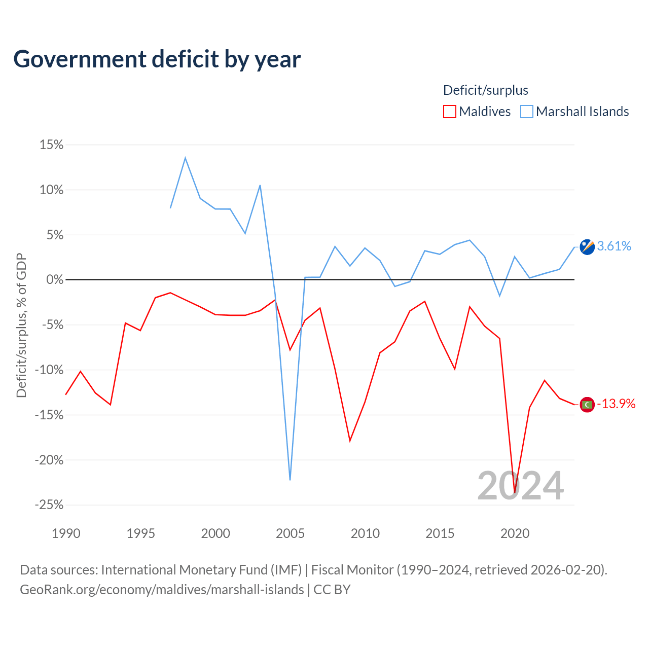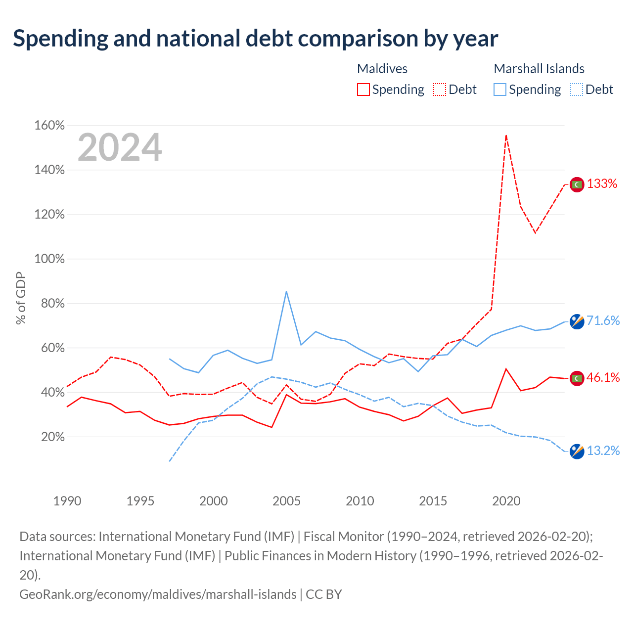 Maldives has $9.41B in government debt (133.3% of GDP), compared to $38.4M (13.2% of GDP) in the Marshall Islands.