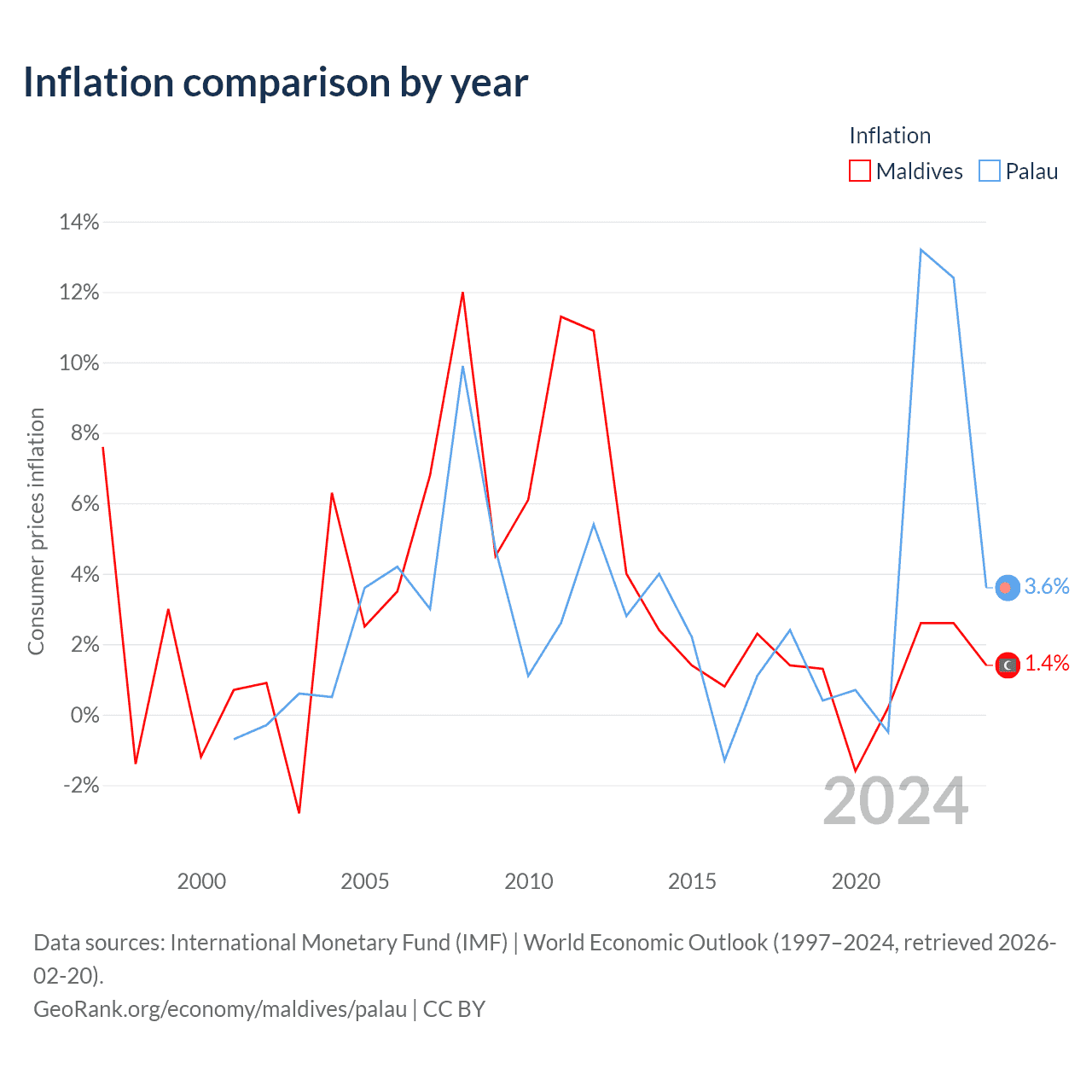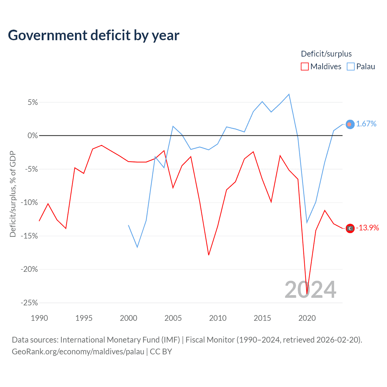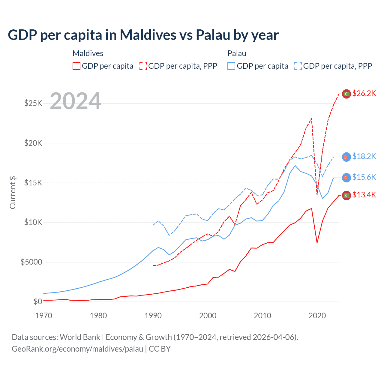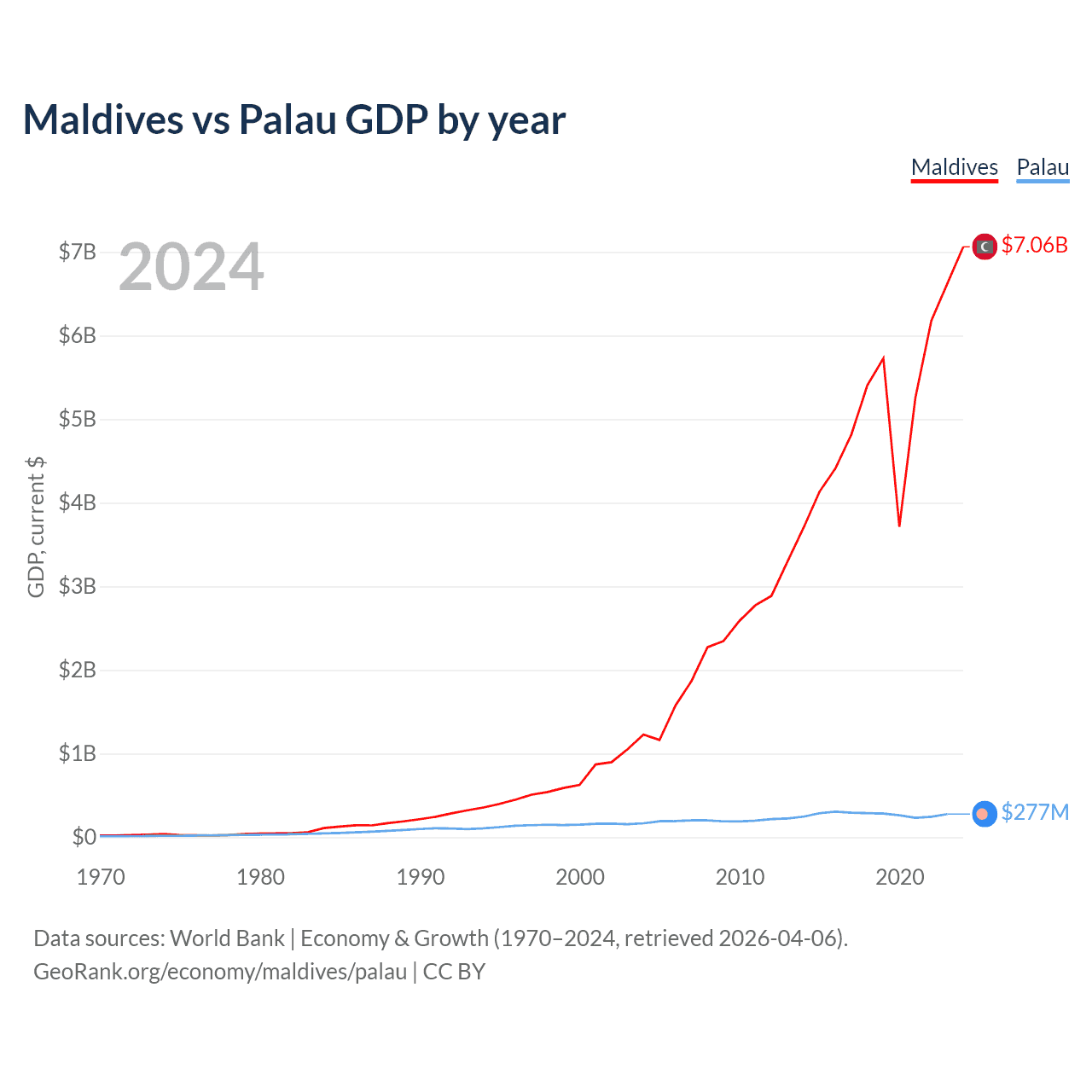 Maldives has a GDP of $7.06B compared to $277M for Palau, ranking 159/197 and 194/197 by economy size, respectively.