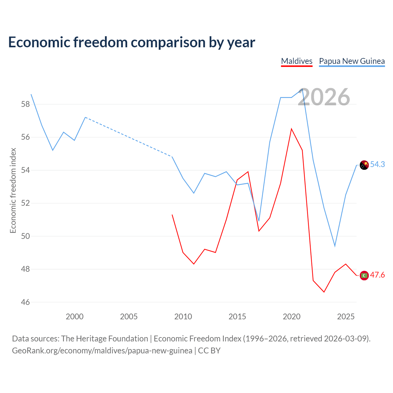 The Economic Freedom Index for Maldives is 47.6, ranking 174/197, compared to 54.3 for Papua New Guinea, ranking 134/197. The chart above displays a comparison of annual changes in economic freedom indexes.