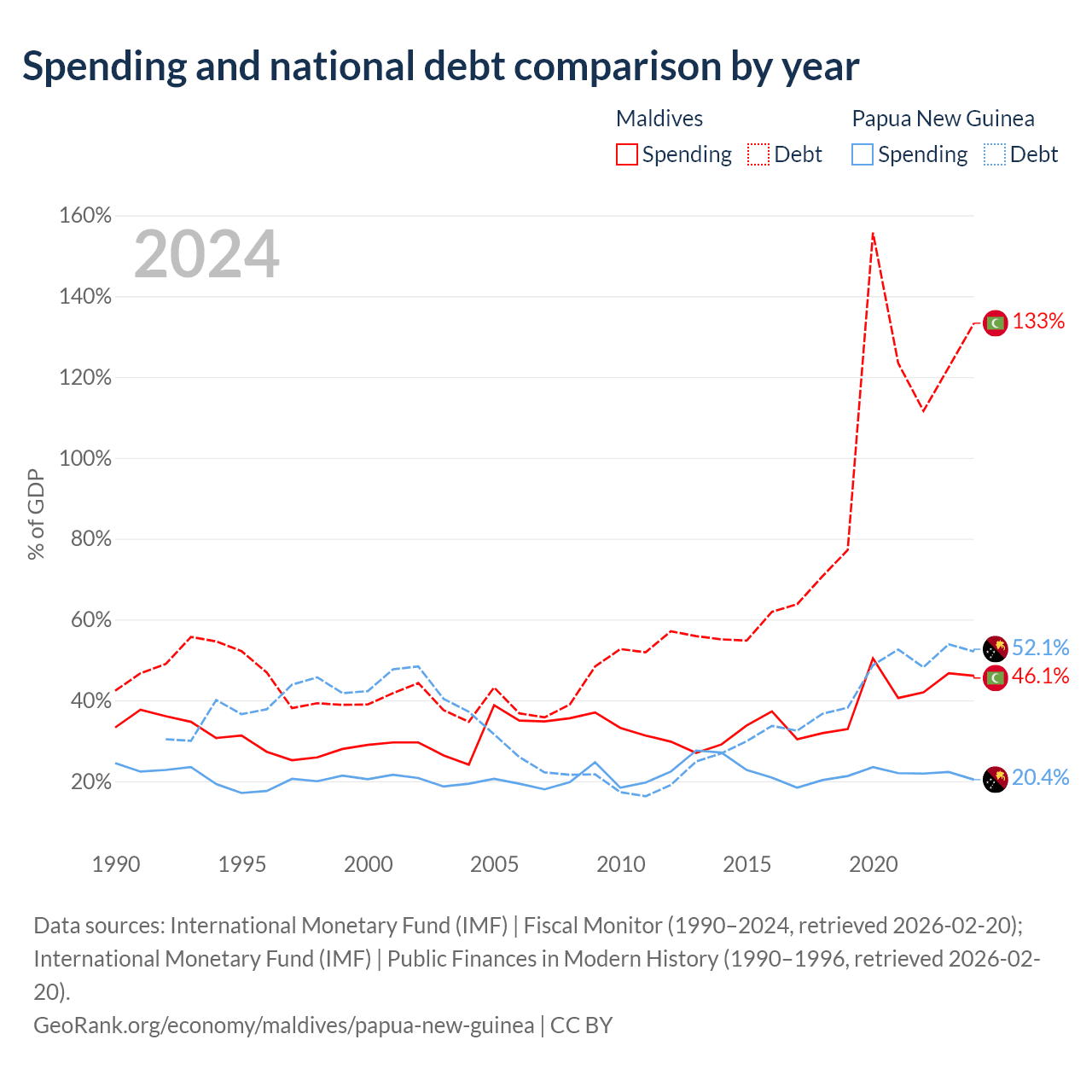 Maldives has $9.41B in government debt (133.3% of GDP), compared to $16.6B (52.1% of GDP) in Papua New Guinea.