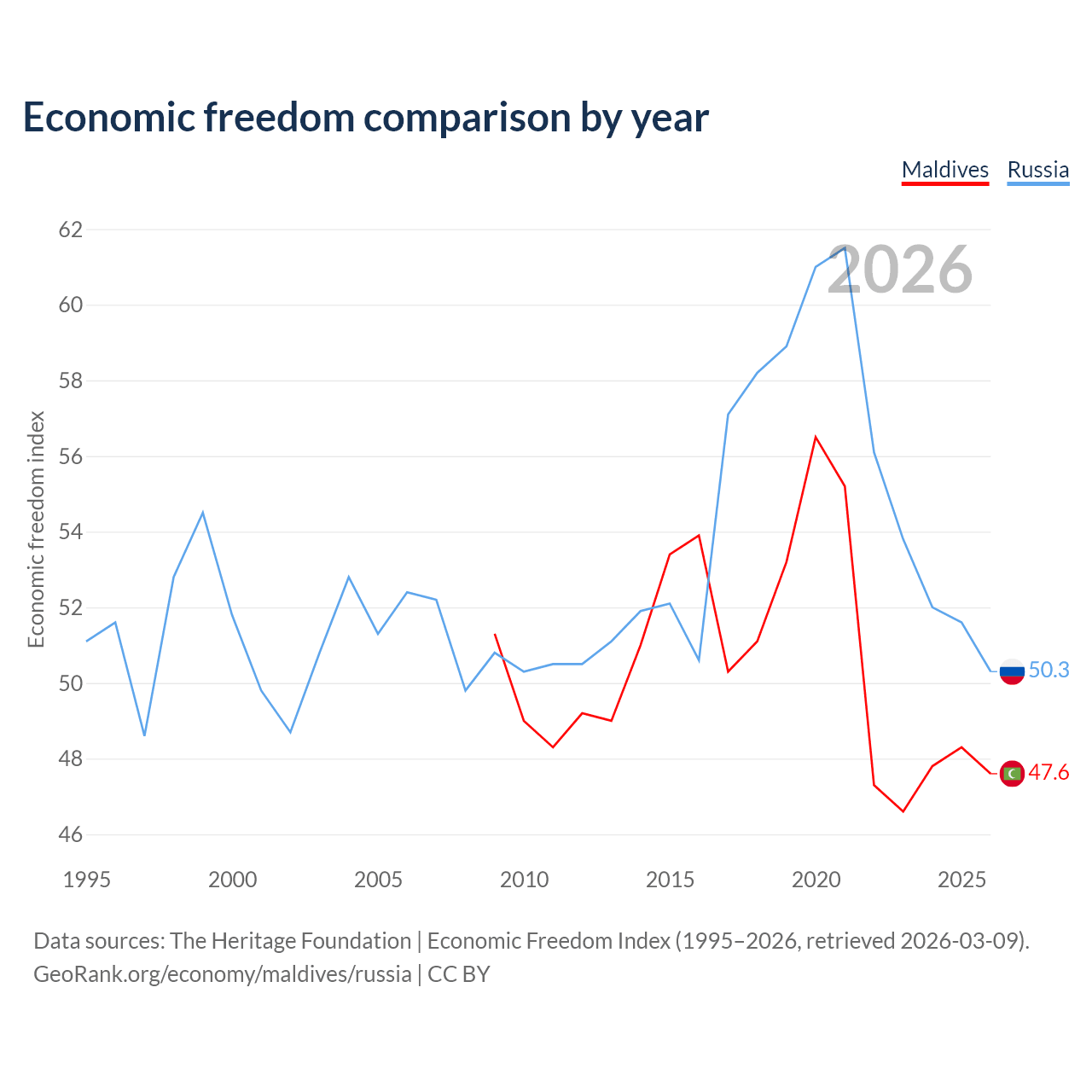 The Economic Freedom Index for Maldives is 47.6, ranking 174/197, compared to 50.3 for Russia, ranking 161/197. The chart above displays a comparison of annual changes in economic freedom indexes.