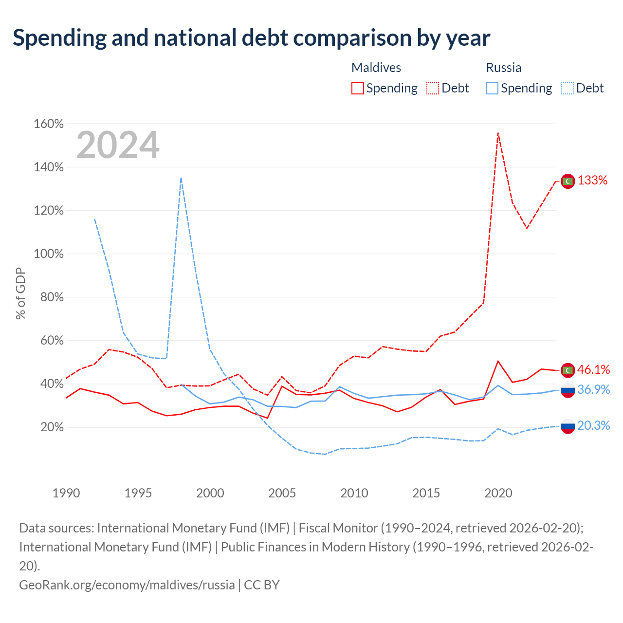Maldives has $9.41B in government debt (133.3% of GDP), compared to $440B (20.3% of GDP) in Russia.