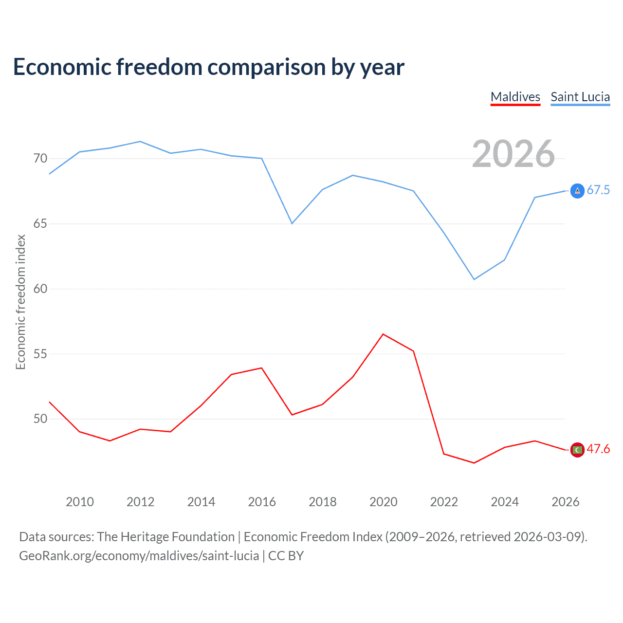 The Economic Freedom Index for Maldives is 47.6, ranking 174/197, compared to 67.5 for Saint Lucia, ranking 57/197. The chart above displays a comparison of annual changes in economic freedom indexes.