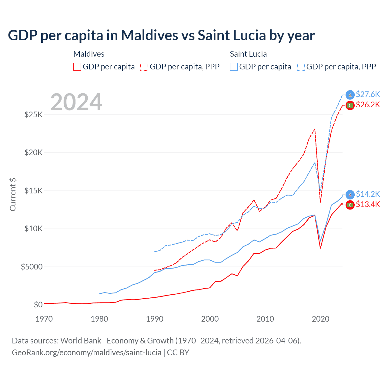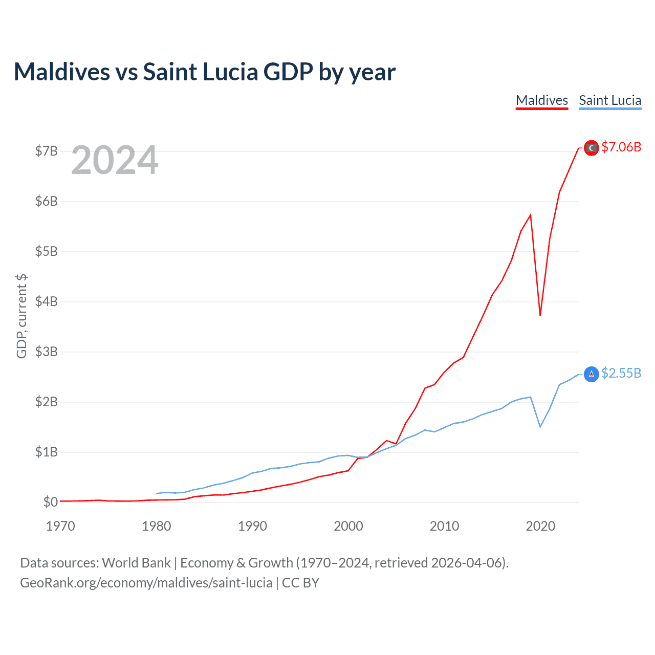 Maldives has a GDP of $7.06B compared to $2.55B for Saint Lucia, ranking 159/197 and 173/197 by economy size, respectively.