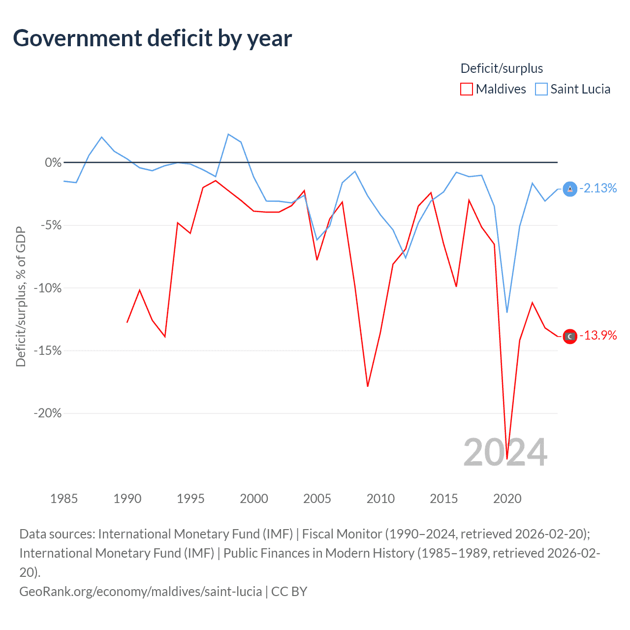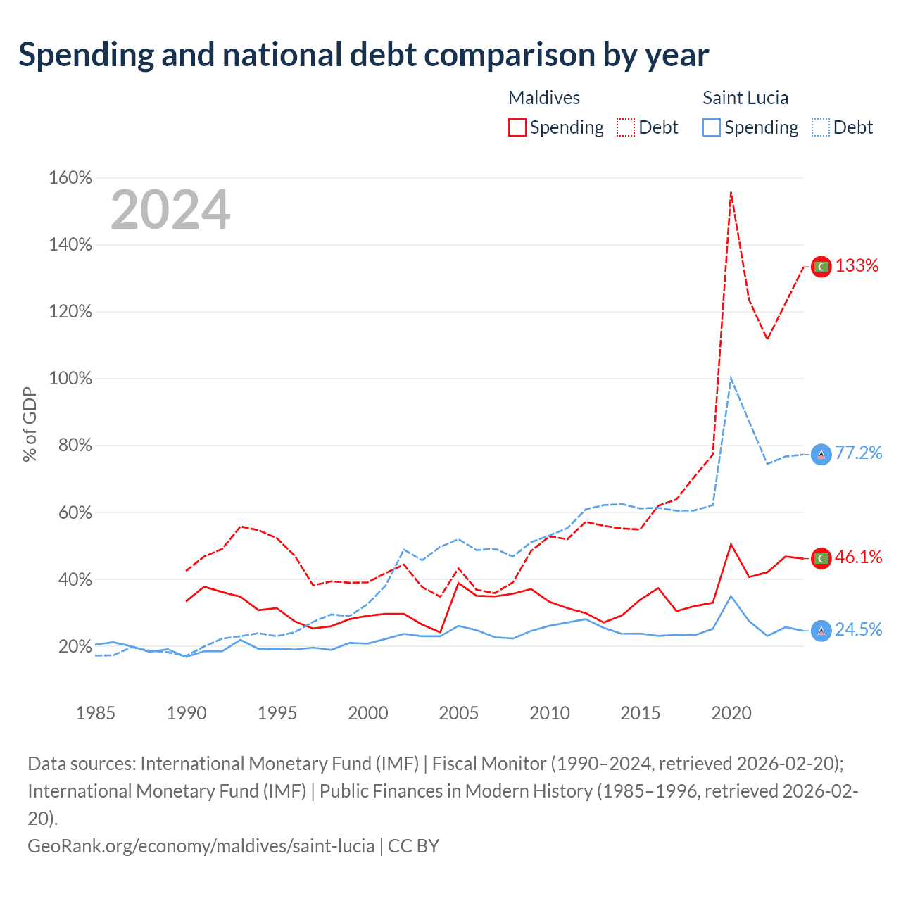 Maldives has $9.41B in government debt (133.3% of GDP), compared to $1.97B (77.2% of GDP) in Saint Lucia.