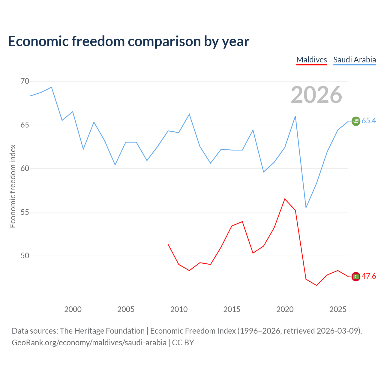 The Economic Freedom Index for Maldives is 47.6, ranking 174/197, compared to 65.4 for Saudi Arabia, ranking 65/197. The chart above displays a comparison of annual changes in economic freedom indexes.