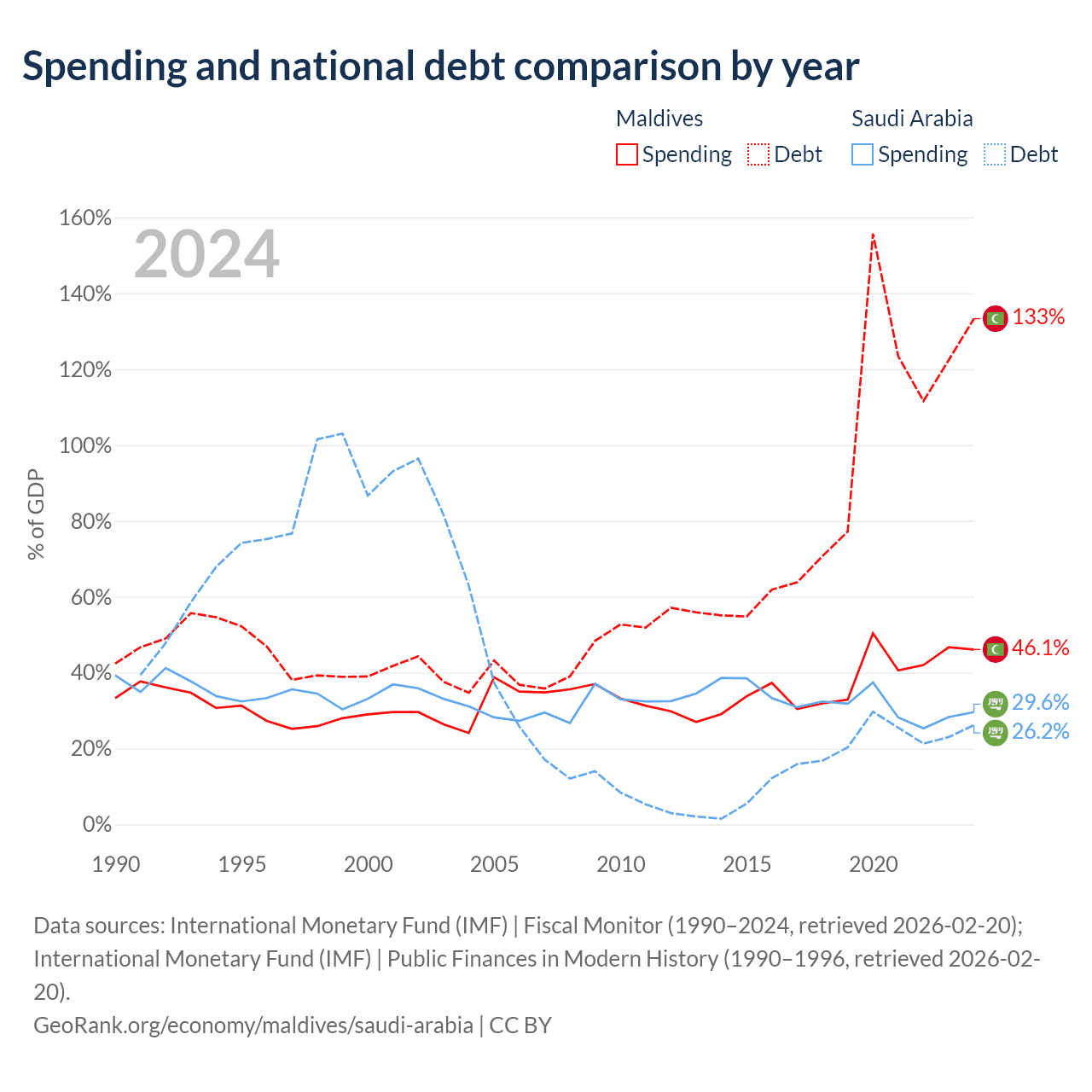 Maldives has $9.41B in government debt (133.3% of GDP), compared to $324B (26.2% of GDP) in Saudi Arabia.