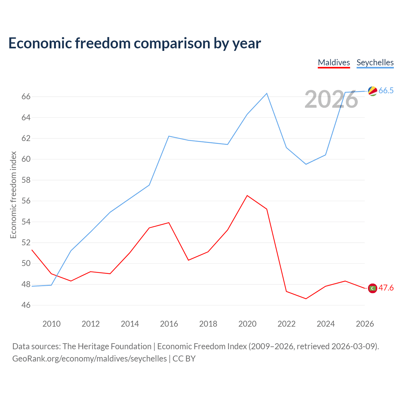 The Economic Freedom Index for Maldives is 47.6, ranking 174/197, compared to 66.5 for the Seychelles, ranking 60/197. The chart above displays a comparison of annual changes in economic freedom indexes.