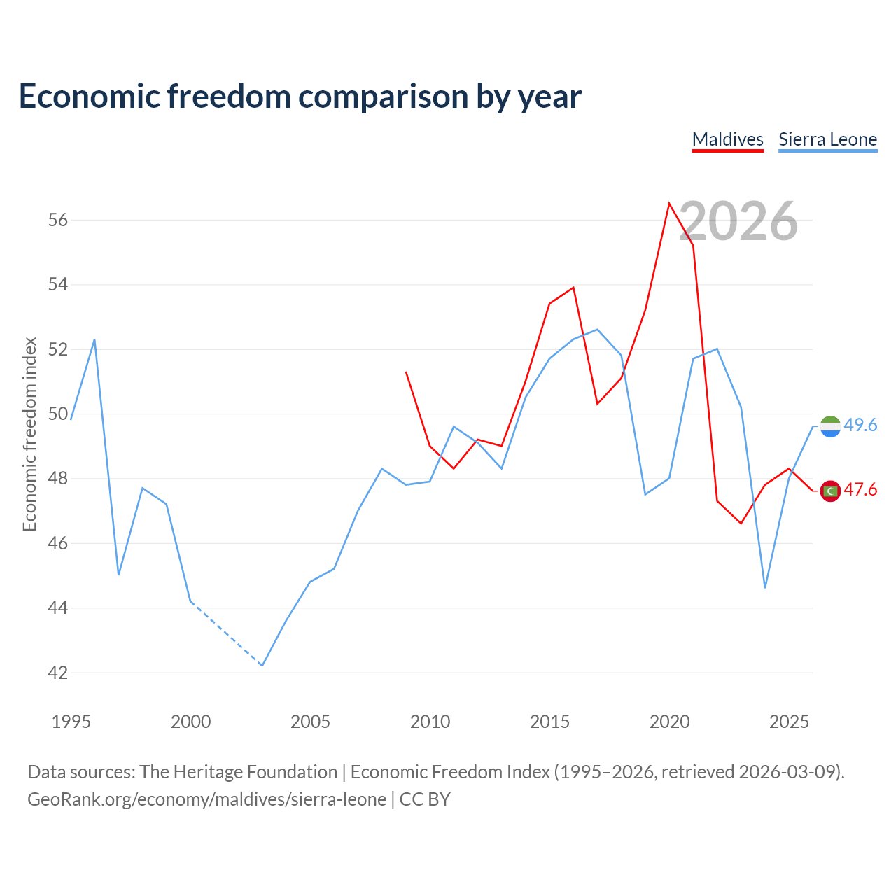 The Economic Freedom Index for Maldives is 47.6, ranking 174/197, compared to 49.6 for Sierra Leone, ranking 165/197. The chart above displays a comparison of annual changes in economic freedom indexes.
