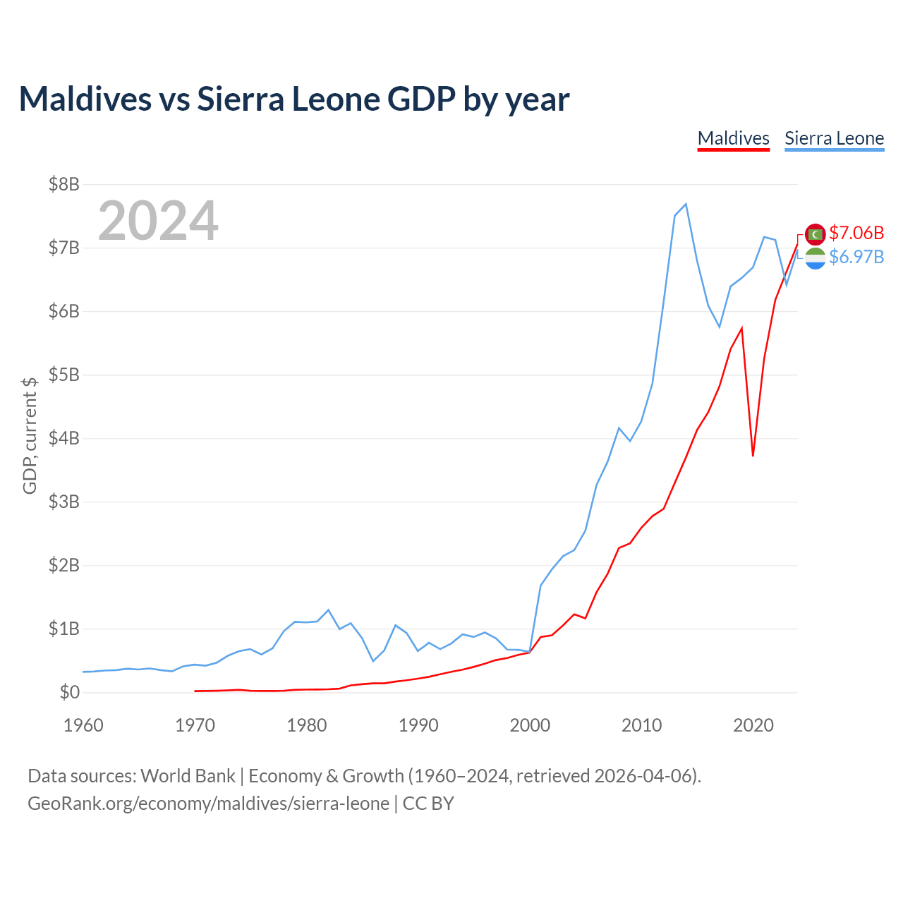 Maldives has a GDP of $7.06B compared to $6.97B for Sierra Leone, ranking 159/197 and 160/197 by economy size, respectively.