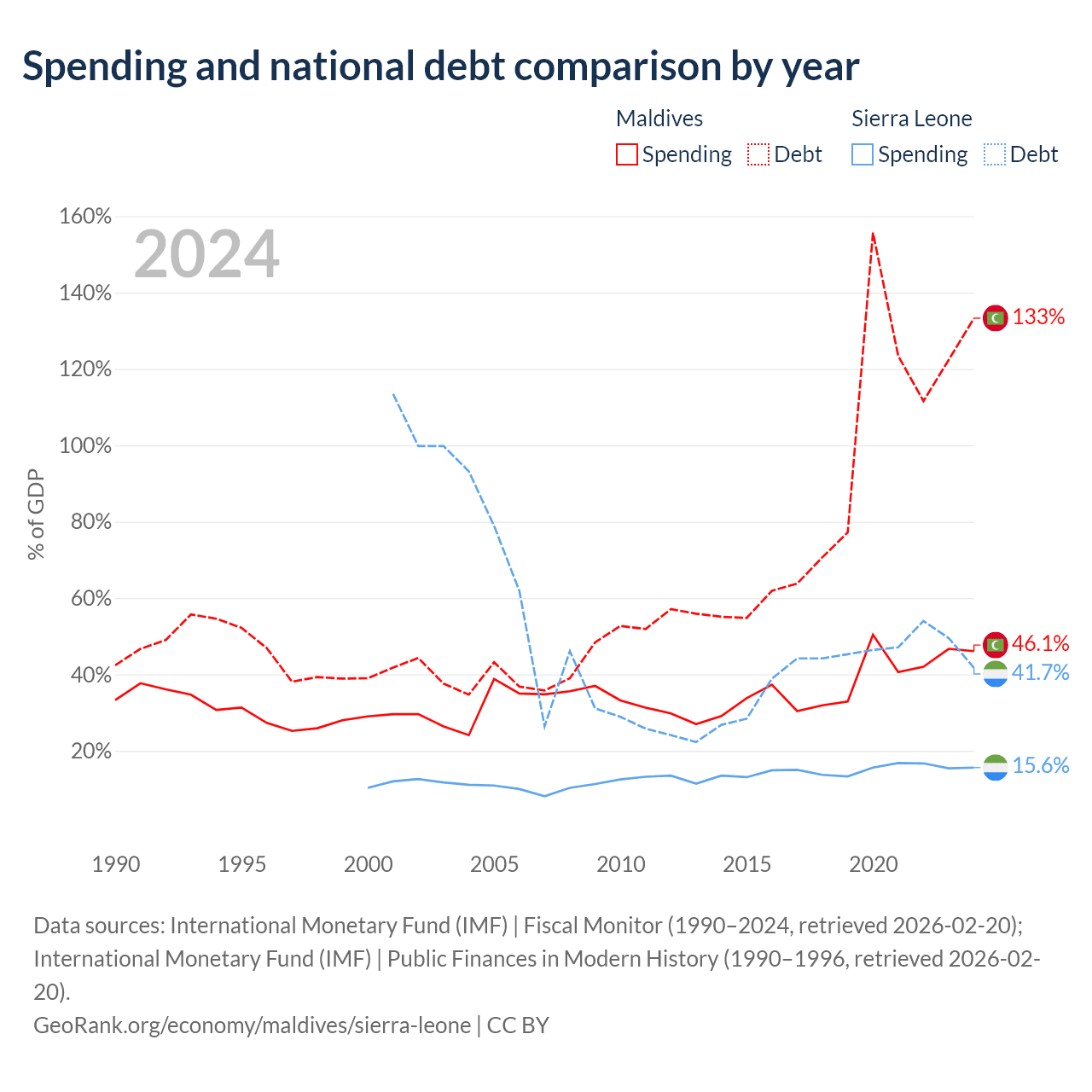 Maldives has $9.41B in government debt (133.3% of GDP), compared to $2.91B (41.7% of GDP) in Sierra Leone.