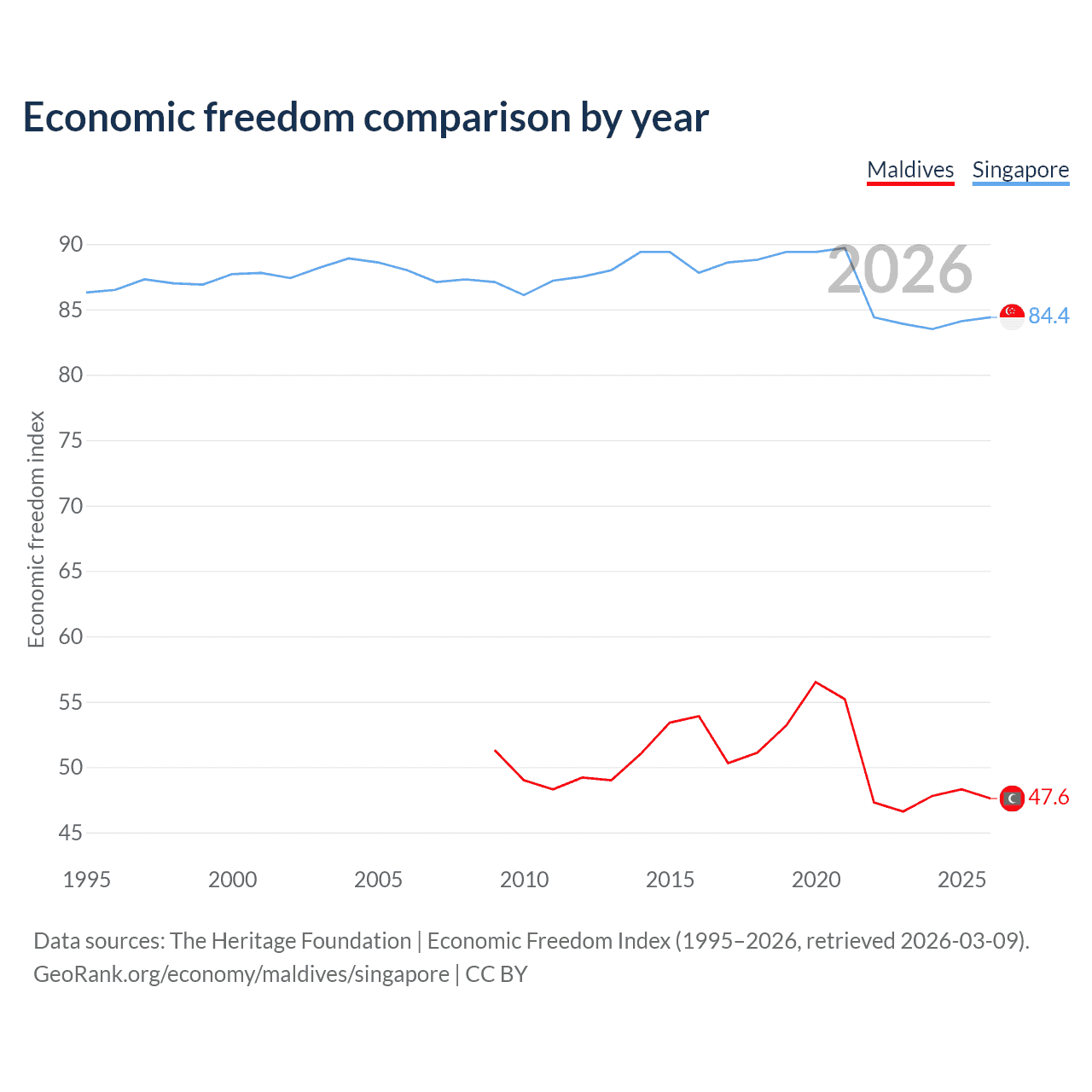 The Economic Freedom Index for Maldives is 47.6, ranking 174/197, compared to 84.4 for Singapore, ranking 1/197. The chart above displays a comparison of annual changes in economic freedom indexes.