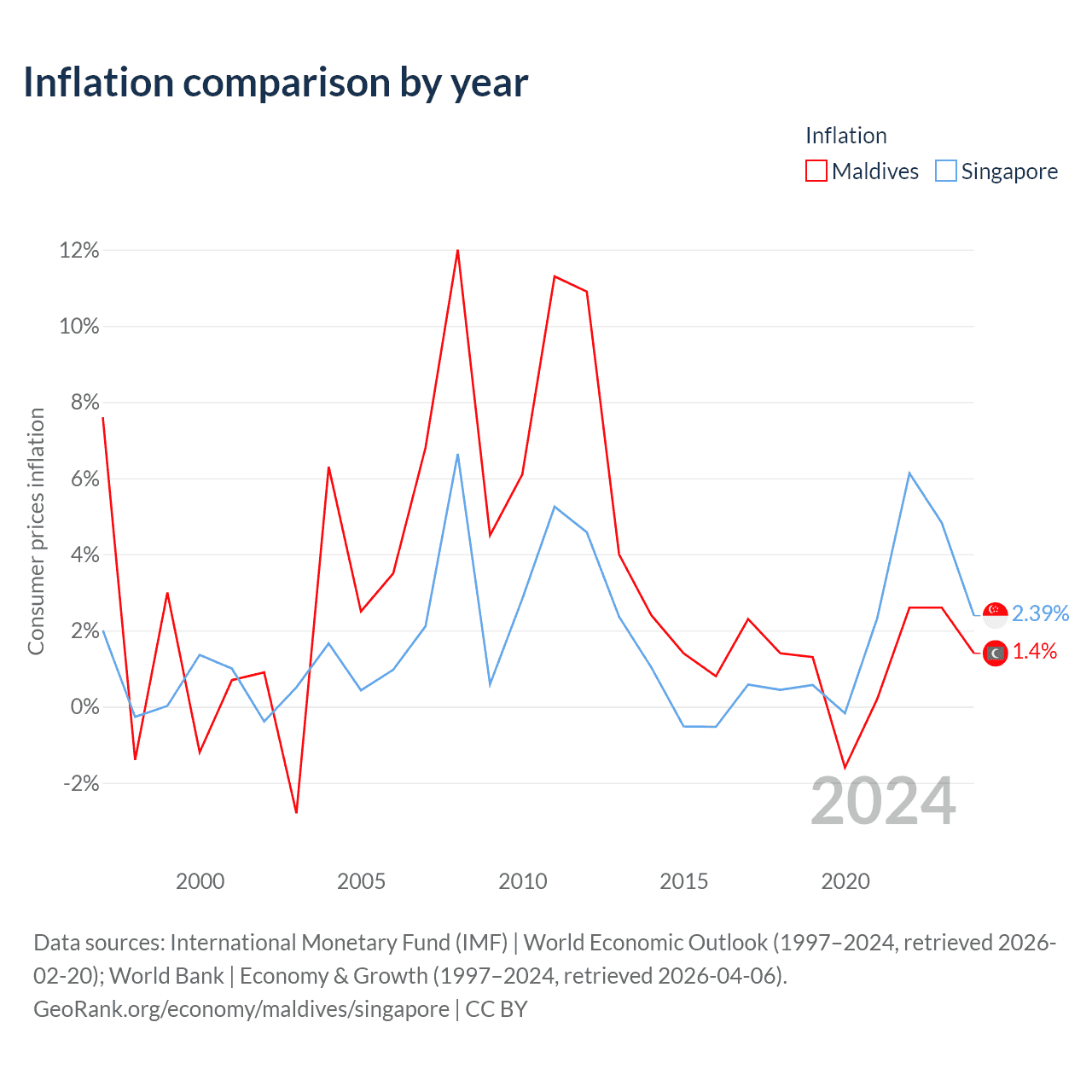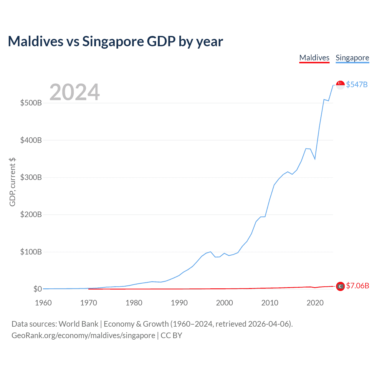 Maldives has a GDP of $7.06B compared to $547B for Singapore, ranking 159/197 and 28/197 by economy size, respectively.