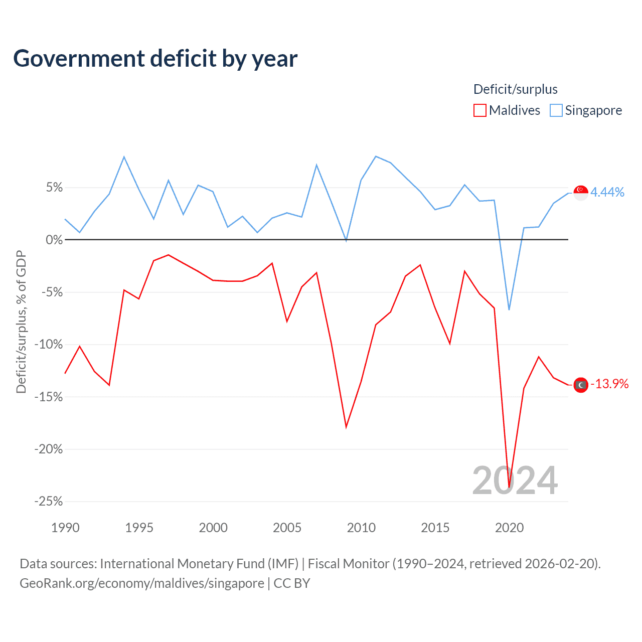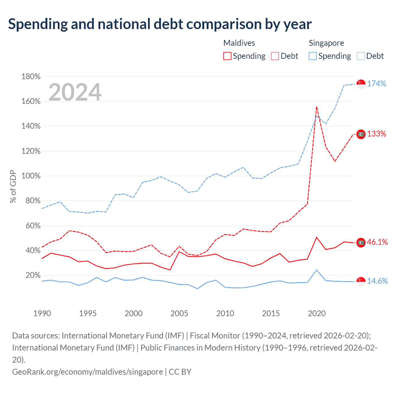 Maldives has $9.41B in government debt (133.3% of GDP), compared to $950B (173.5% of GDP) in Singapore.