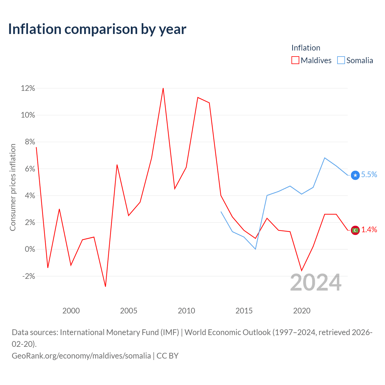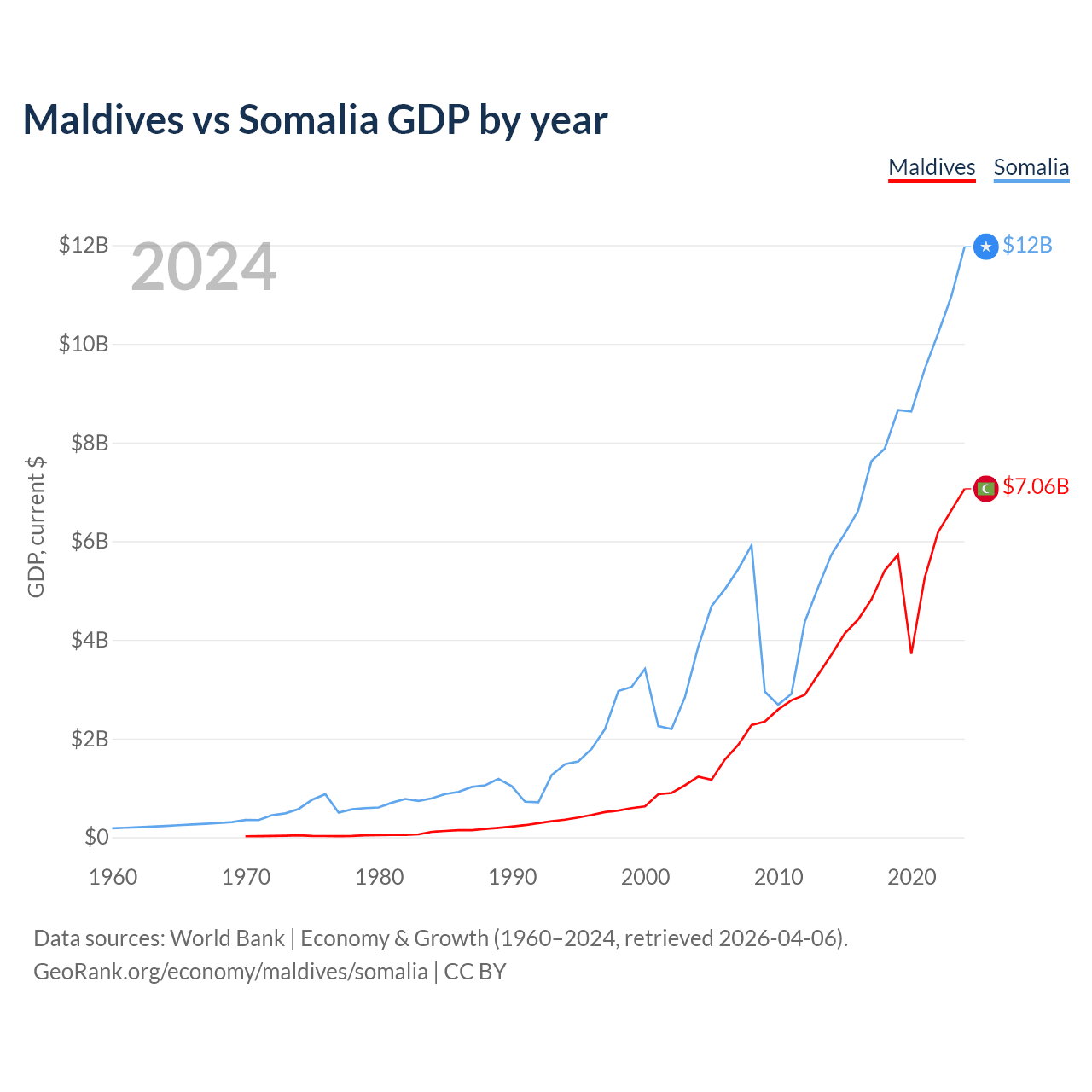 Maldives has a GDP of $7.06B compared to $12B for Somalia, ranking 159/197 and 150/197 by economy size, respectively.