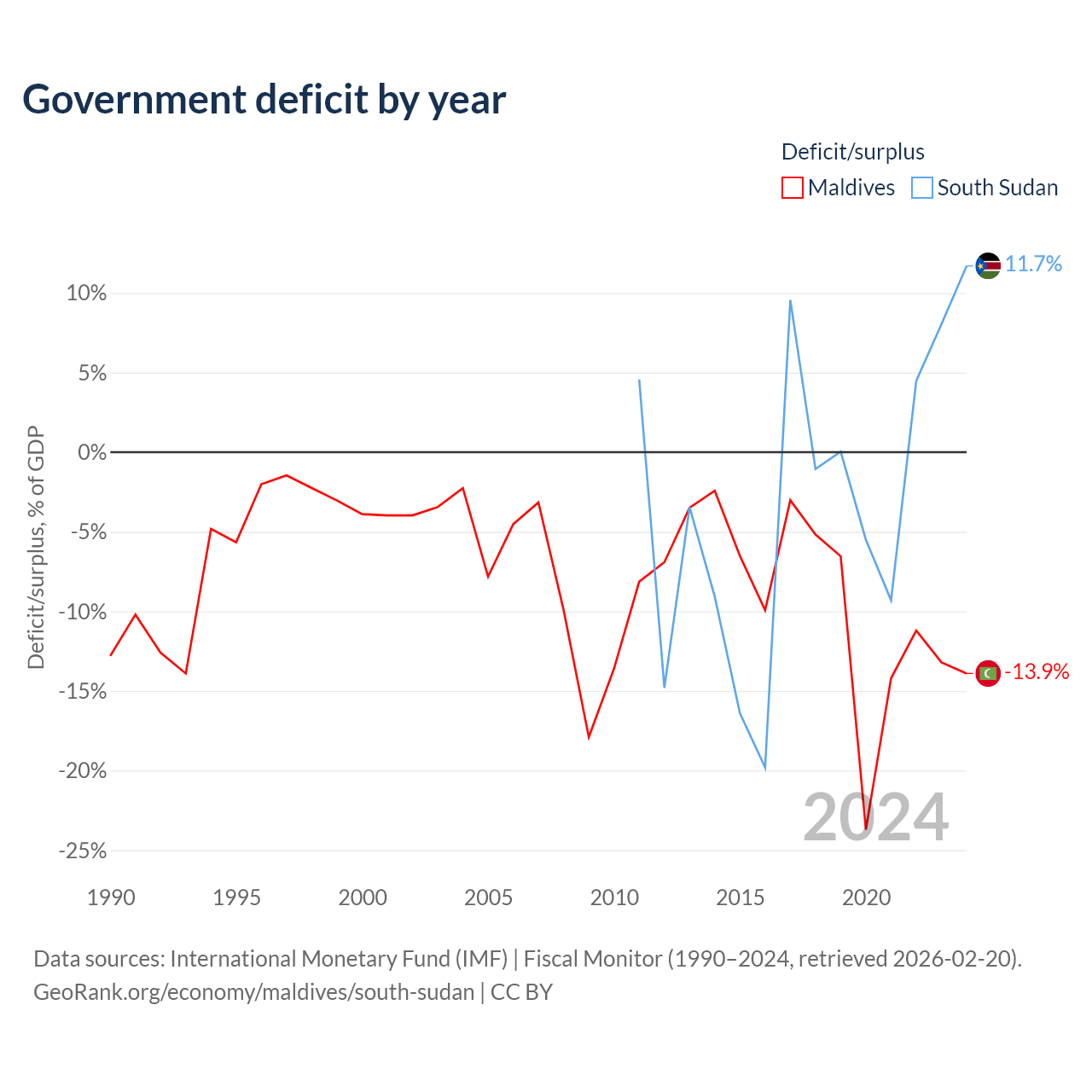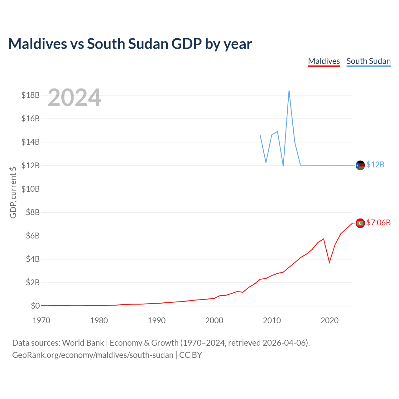 Maldives has a GDP of $7.06B compared to $12B for South Sudan, ranking 159/197 and 149/197 by economy size, respectively.