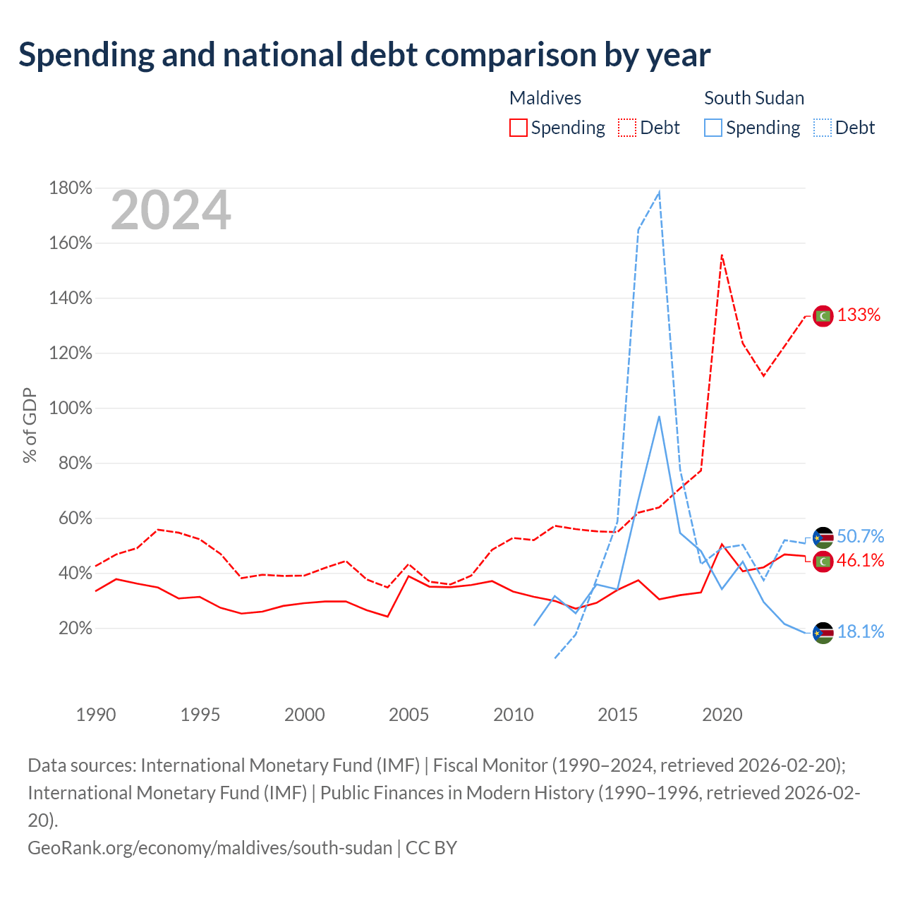 Maldives has $9.41B in government debt (133.3% of GDP), compared to $7.04B (50.7% of GDP) in South Sudan.