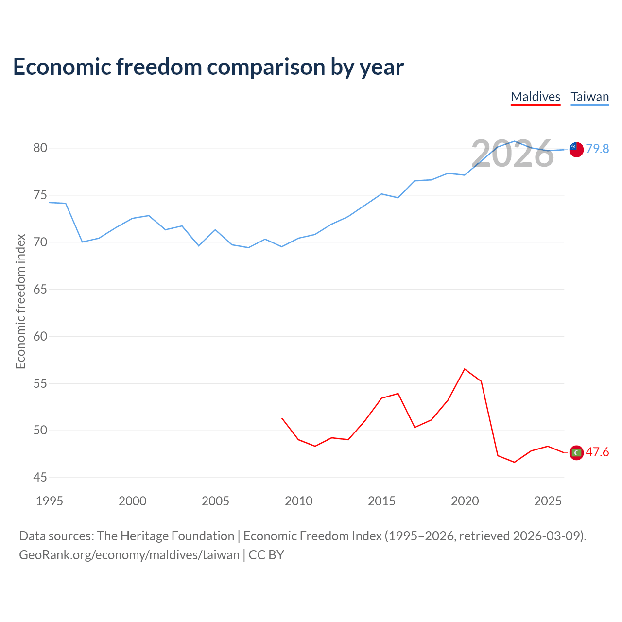 The Economic Freedom Index for Maldives is 47.6, ranking 174/197, compared to 79.8 for Taiwan, ranking 6/197. The chart above displays a comparison of annual changes in economic freedom indexes.