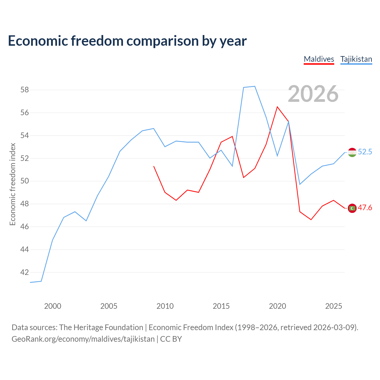 The Economic Freedom Index for Maldives is 47.6, ranking 174/197, compared to 52.5 for Tajikistan, ranking 147/197. The chart above displays a comparison of annual changes in economic freedom indexes.