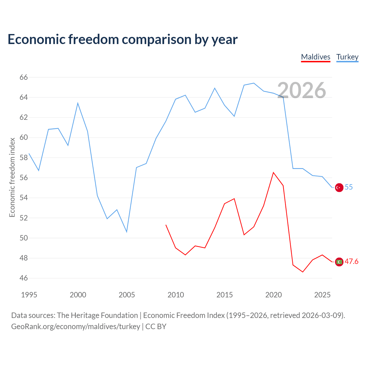 The Economic Freedom Index for Maldives is 47.6, ranking 174/197, compared to 55 for Turkey, ranking 129/197. The chart above displays a comparison of annual changes in economic freedom indexes.