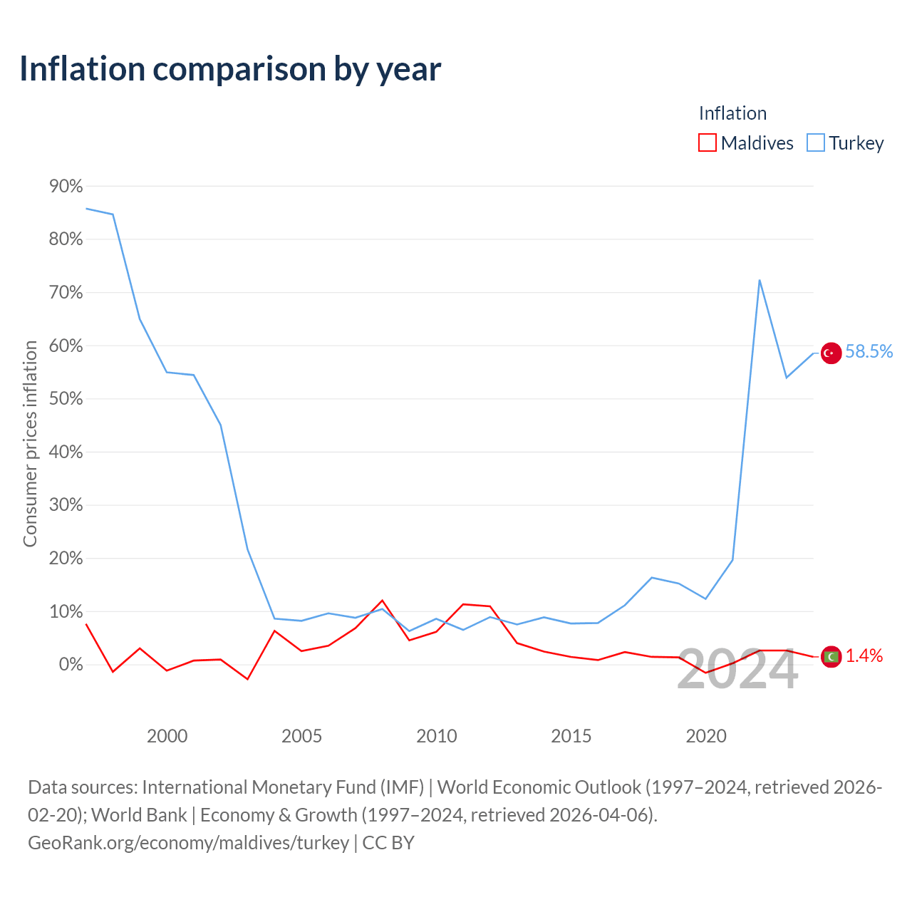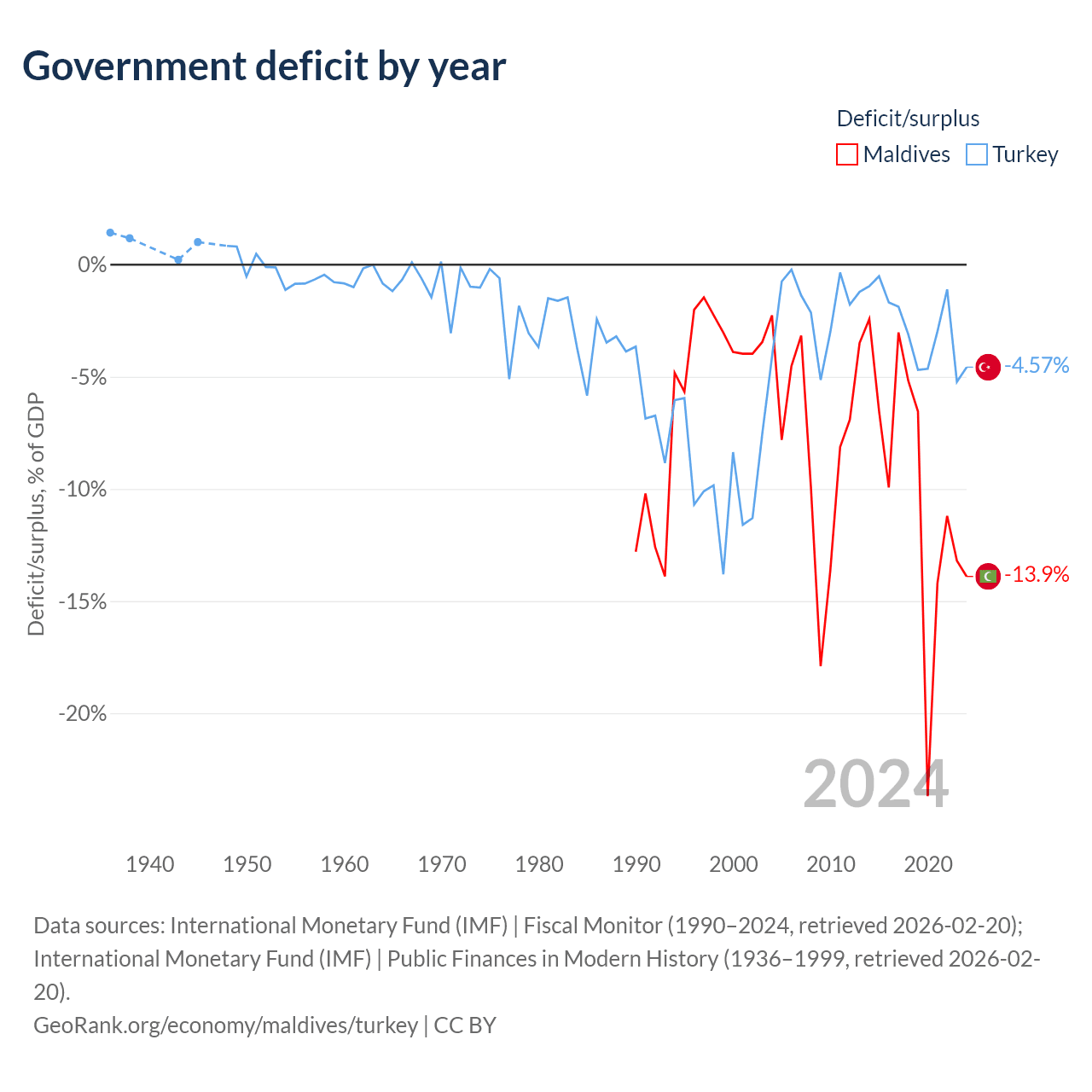 Maldives has a GDP of $7.06B compared to $1.36T for Turkey, ranking 159/197 and 17/197 by economy size, respectively.