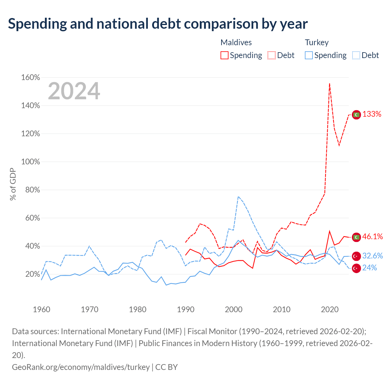 Maldives has $9.41B in government debt (133.3% of GDP), compared to $327B (24% of GDP) in Turkey.