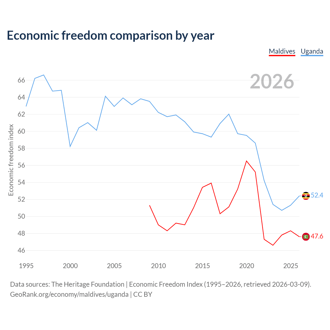 The Economic Freedom Index for Maldives is 47.6, ranking 174/197, compared to 52.4 for Uganda, ranking 149/197. The chart above displays a comparison of annual changes in economic freedom indexes.